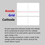 If the pixel colour is pure white (RGB 255,255,255), the corresponding cell is set as a free-floating point, otherwise the cell is assumed to be at a fixed electrode potential, determined as follows. If the pixel colour contains only a red component (RGB values from 1,0,0 to 255,0,0), the voltage is positive and set equal to the red component. It can take a range from +1V to +255V. If the pixel colour is pure black (RGB 0,0,0), the voltage is 0V. If the pixel colour contains only a blue component (RGB values from 0,0,1 to 0,0,255), the voltage is negative and set equal to the negative of the blue component. It can take a range from -1V to -255V.