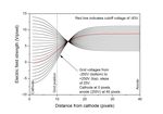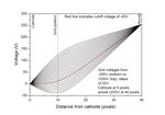 Here are graphs of the voltage and field strength versus distance from the cathode, and a graph of the surface field strength at the cathode versus the grid voltage. These are obtained from data measured along a vertical line down the center of the image, indicated by the grey line in the first photo above. You can clearly see how the grid voltage influences the voltage and electric field distributions. The grid cutoff voltage, where the field strength at the cathode surface is zero, is around 93V.