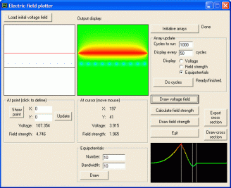 Once the arrays have been intialised, the averaging algorithm is then run and repeated around 500-1000 times to obtain a reasonably steady-state result. The software can then plot the equipotentials, electric field strength etc.