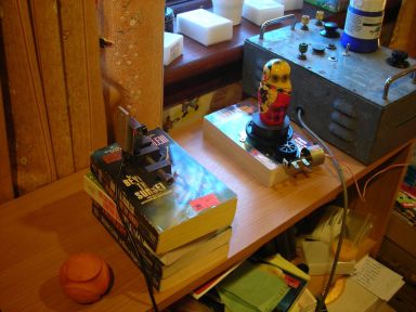 I realised I could just rig up a turntable, point the webcam at it, and I should get a pretty decent scan of the object's surface. Here's the setup (click for larger):