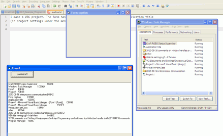 When I now list the handles of the available windows (using the example program given above), there are separate entries for "Form caption" and "Application title" with different window handles!. (E0900 and 16091E, respectively) In addition, "Application title" appears in the Task Manager, not "Form caption". Screenshot: