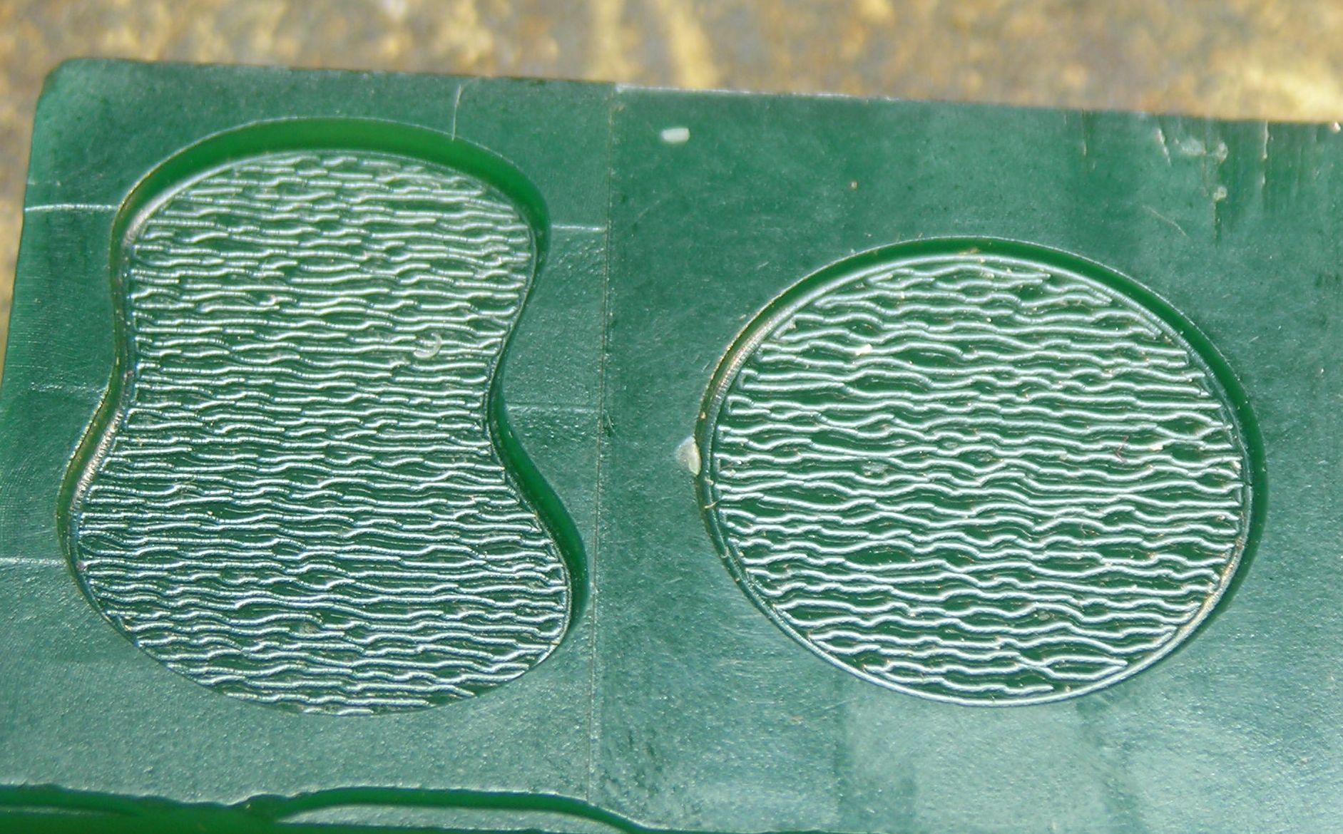 Lastly, here's some actual examples of the shading produced. The green stuff is modelling wax. I also tried one in acrylic, and then embossed some thin (0.1mm) copper foil in the hydraulic press - it worked pretty well.
