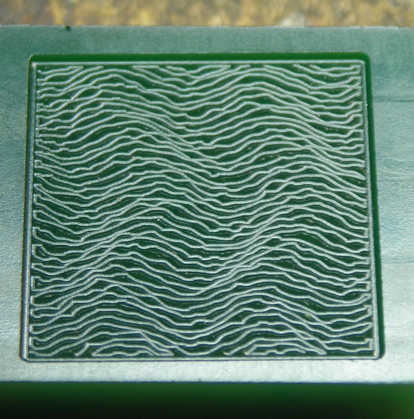 The background shading in that design was done with lines 0.25mm apart using a 0.5mm ball-nose cutter. The linear shading pattern than results is very nice, but I realised that some pieces might benefit from a more random texture.