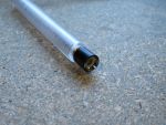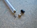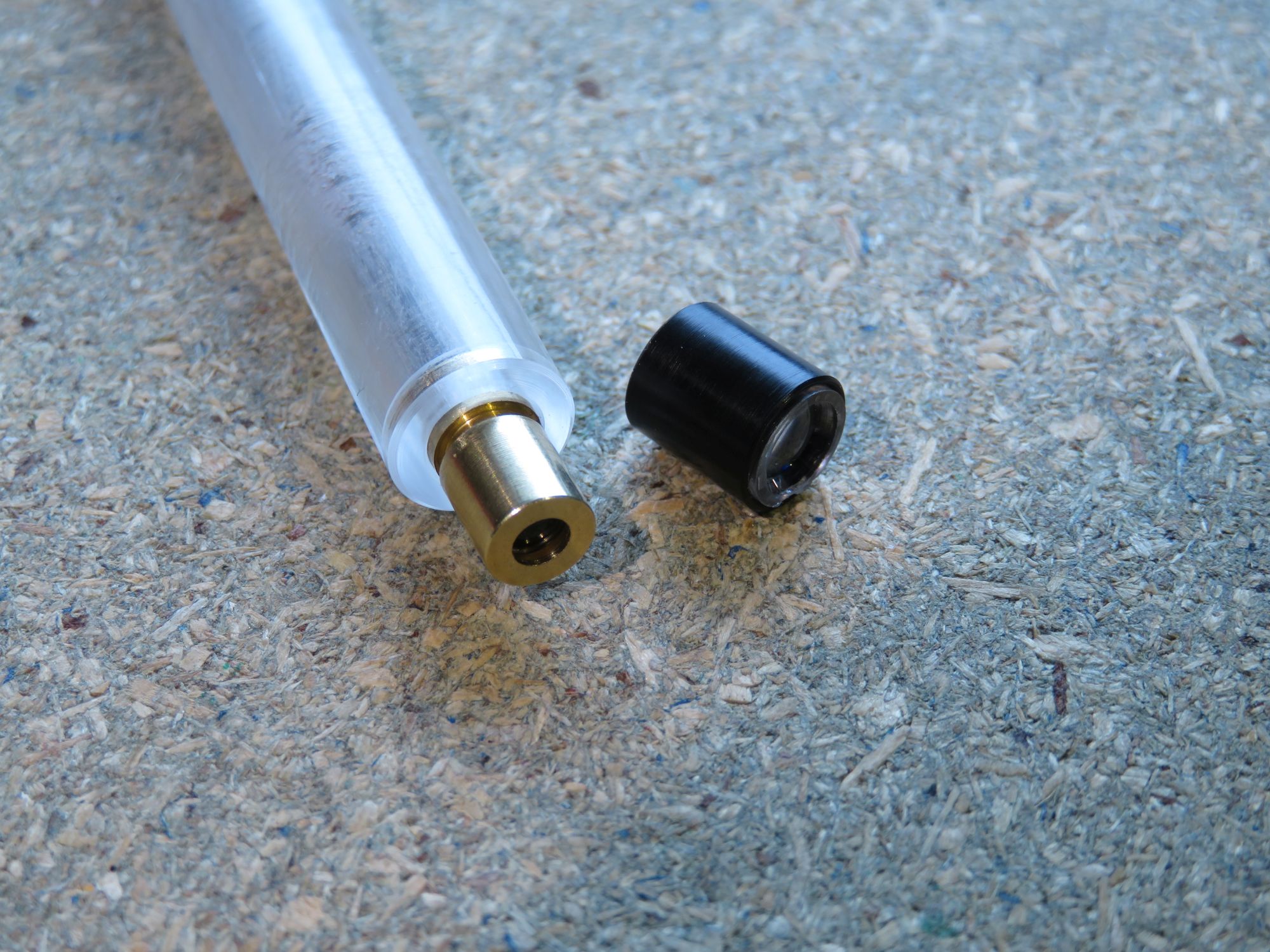 The actual diode is carefully pressed into the brass body of the housing. The spring holds the 5mm collimating lens inside the brass cap. I made a small plastic cylindrical sleeve which holds the 7mm focusing lens on the front of the brass cap. The whole laser diode assembly is mounted in a tubular plastic body, approximately the same diameter as the pens I'll be using, so I can swap between pen and laser without worrying about alignment problems.