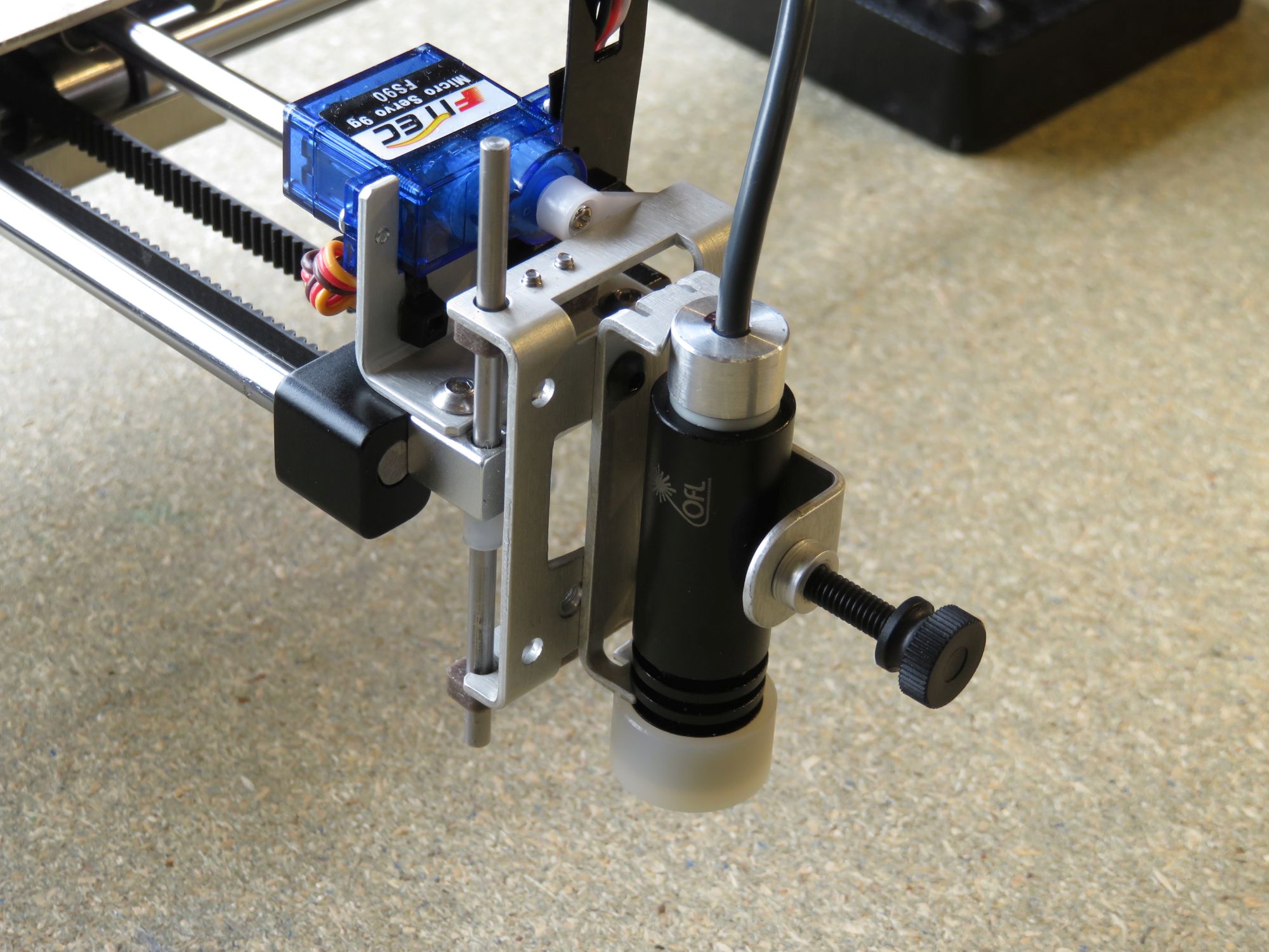 I had previously made up a module using a 100mW 405nW UV laser diode and I'd built the power supply so it could be operated from the TTL output on my big laser cutter. This has a cylindrical metal housing and a focusable output, so it's ideal for mounting in the AxiDraw's pen holder. I simply used the RB3 output to drive the laser module's TTL input directly, and it worked fine.