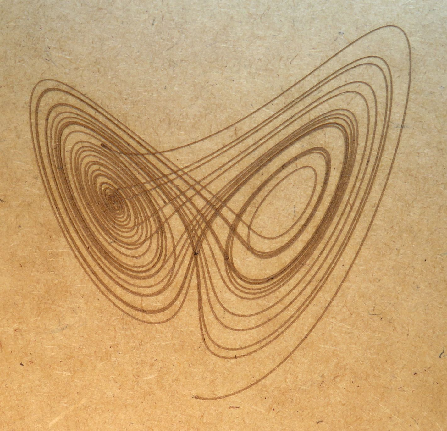 I had previously written a Python script to calculate the Lorenz attractor in realtime and output it to the AxiDraw. While playing around with it, I wanted to try using my big laser cutter to engrave the attractor, so I adapted the Python script to Rhinoscript.