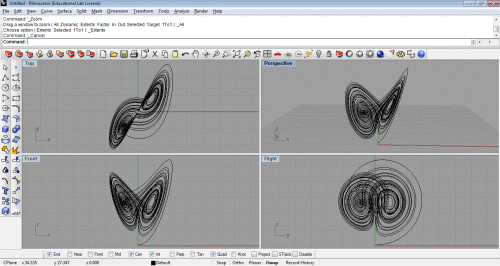 Download the script file here. You can specify which sort of drawing to create - a full 3D curve, or a projection of one of the three planes (the projection is made on to Rhino's XY construction plane). A good value for the maximum steps (stepCnt) is 5000 for a curve - if you're drawing individual points, make this less (e.g. 200), because point drawing is slower. The script first populates an array with the calculated points and, optionally, draws each point as it's calculated - this is good for seeing the attractor evolve. It then draws an interpolated curve through all the points, with the drawPlane option controlling what sort of curve is drawn - 3D or a projection.