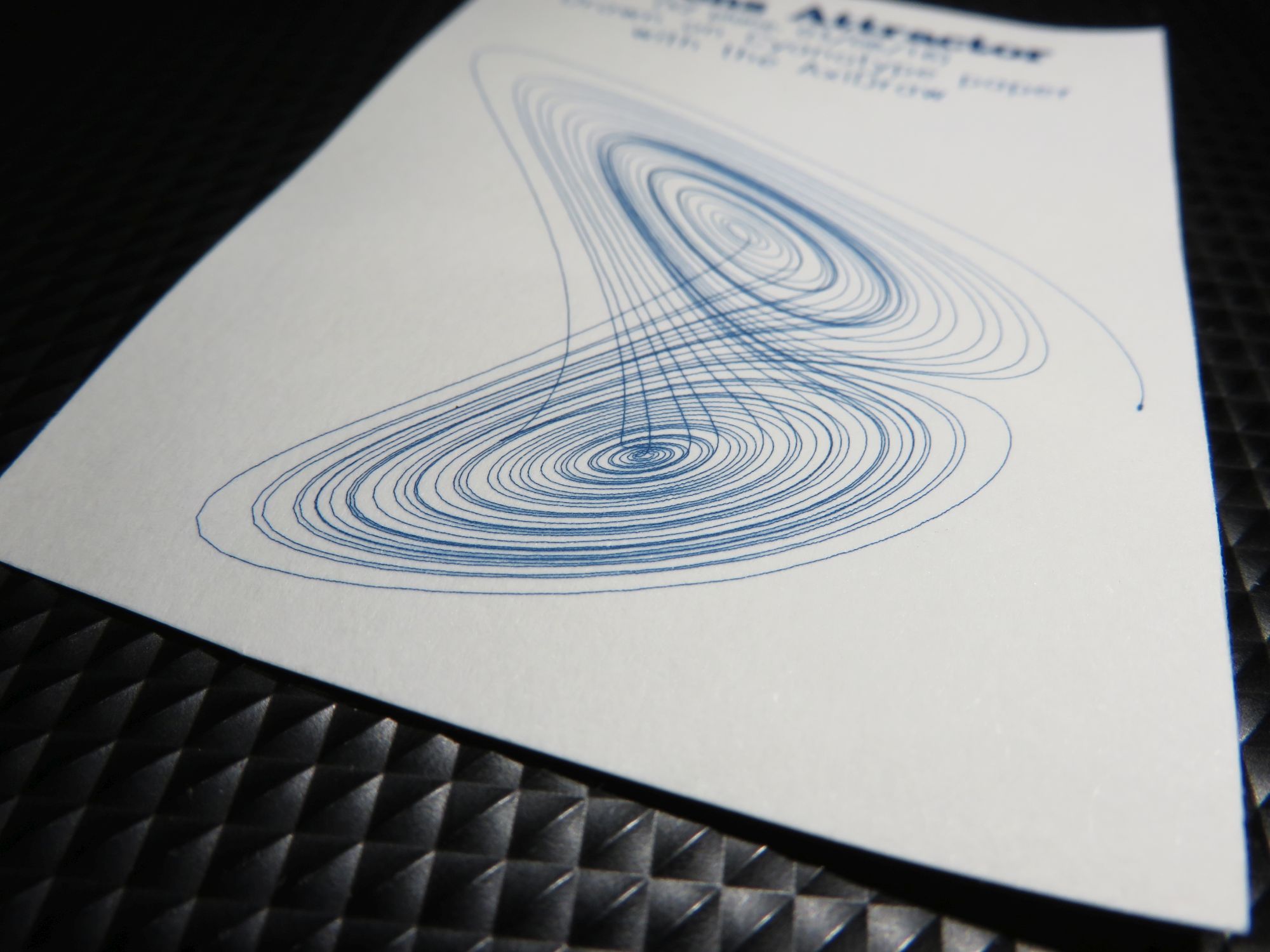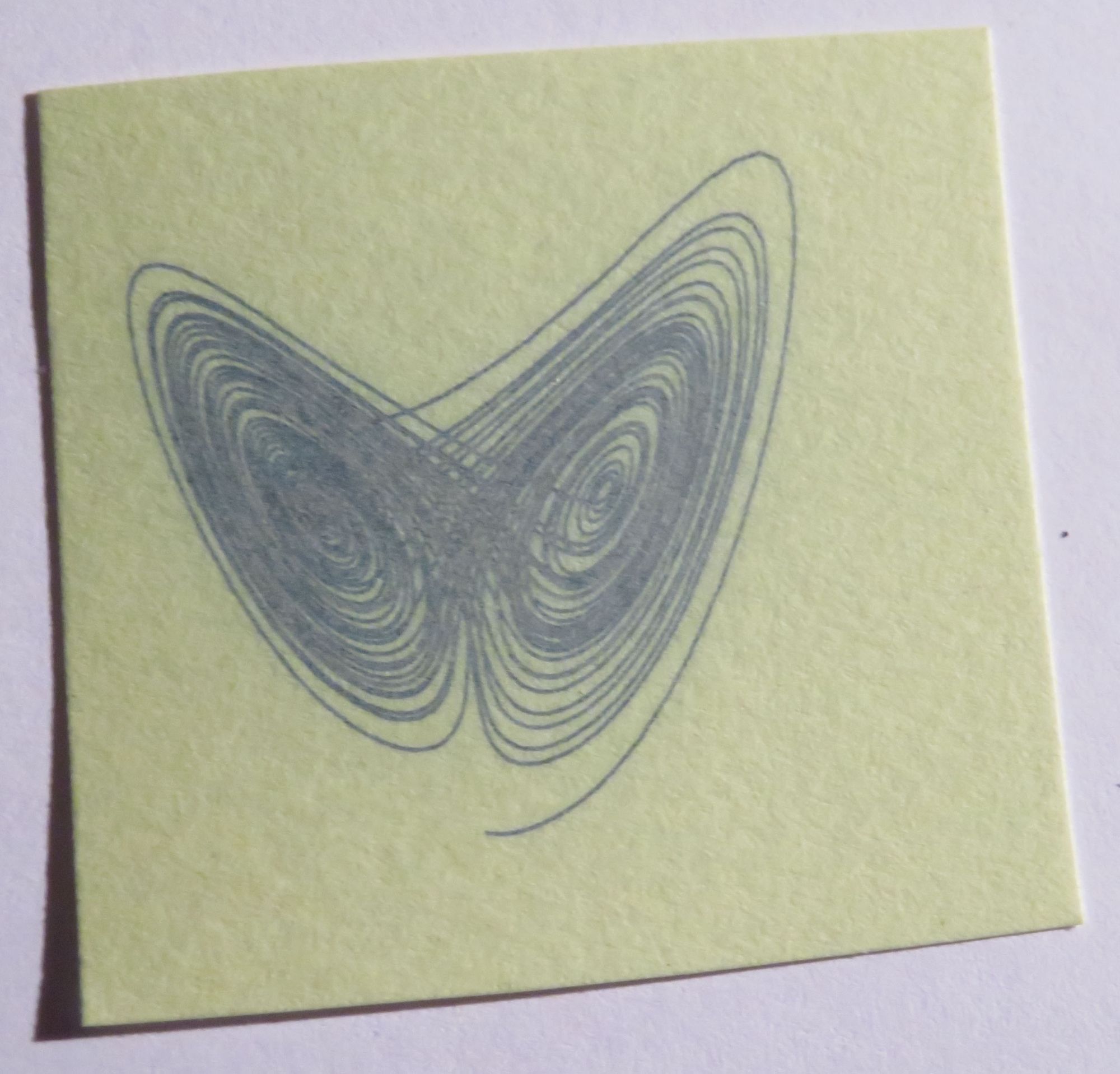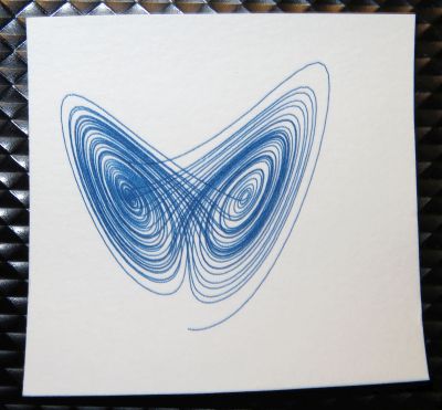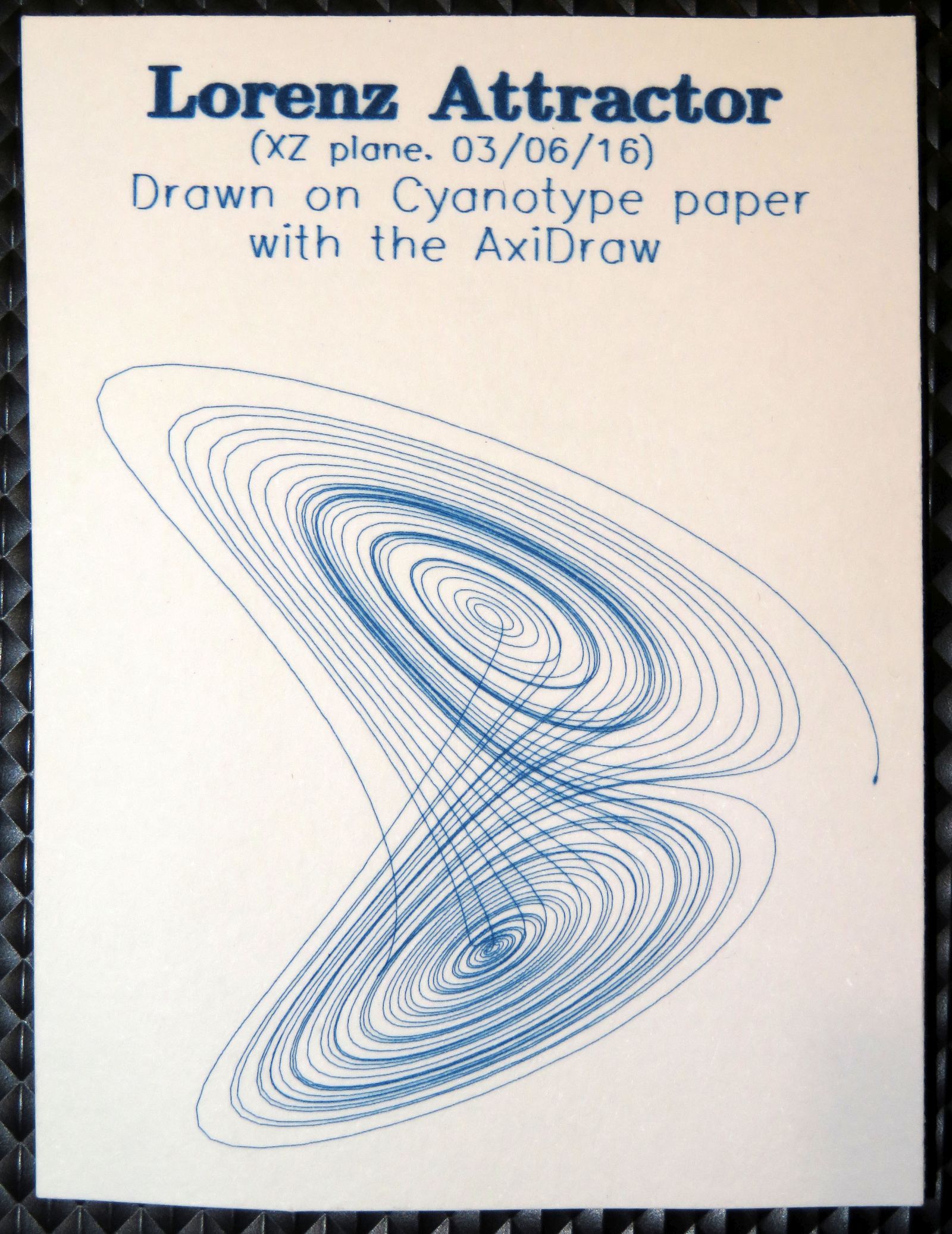 I then fired up the Lorenz attractor script I'd written and tried a full drawing at 5mm/s. Here's the paper just after exposure - you can see a light blue line where the paper has been exposed. The drawing is about 30mm square.