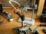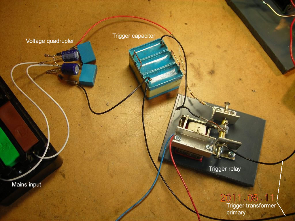 The trigger capacitor I'm using is about 330nF and is composed of C5-C7. It is charged from a voltage quadrupler driven by 240VAC mains to about 1.4kV. Once charged, it is dumped into the primary of the trigger transformer using a solenoid-driven switch. The trigger transformer has a single-turn copper foil primary and a 10-turn secondary, wound on a TV flyback transformer core. This should give an output pulse of around 14kV. The secondary of the transformer is placed in series with the main storage capacitor (56000µF 50V) and the TIG torch, as shown. Another solenoid-driven switch is used to isolate the main storage capacitor from the TIG torch until ready for discharge.