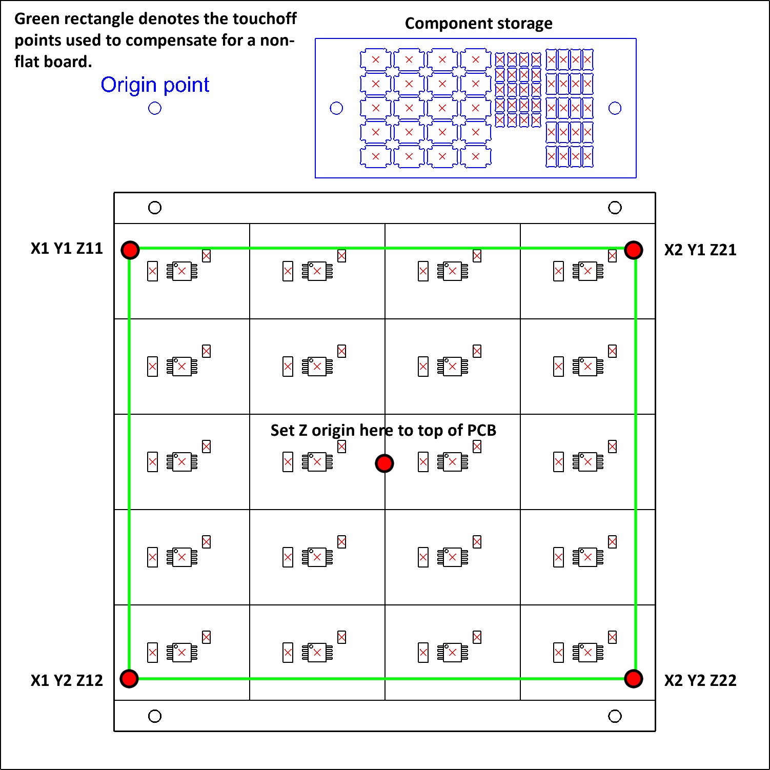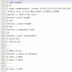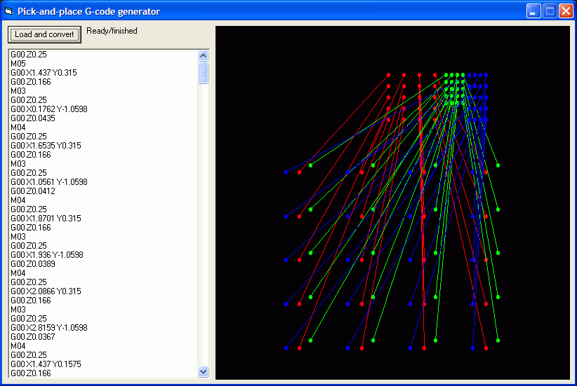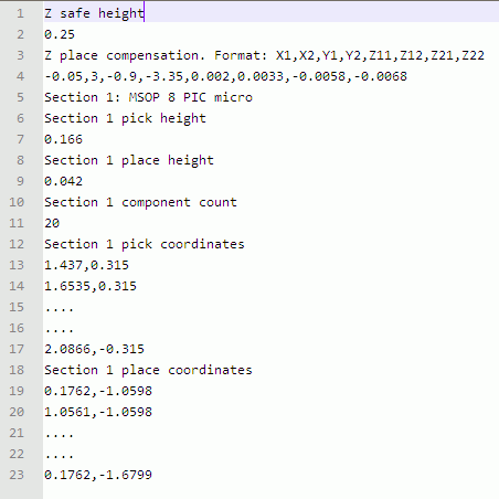 I wrote a small program to convert a list of coordinates, pick heights, place heights, correction factors etc. into a G-code file which the router can run. It probably isn't much use to anyone else, so here's just some screenshots of the board layout, input data and program: