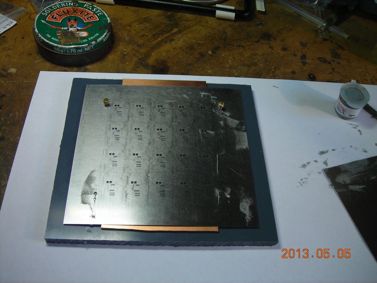 Applying solder paste to board (I used a cabinet scraper):