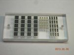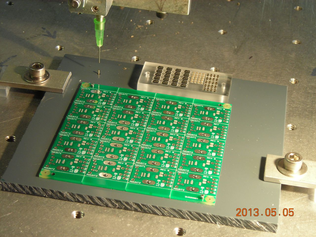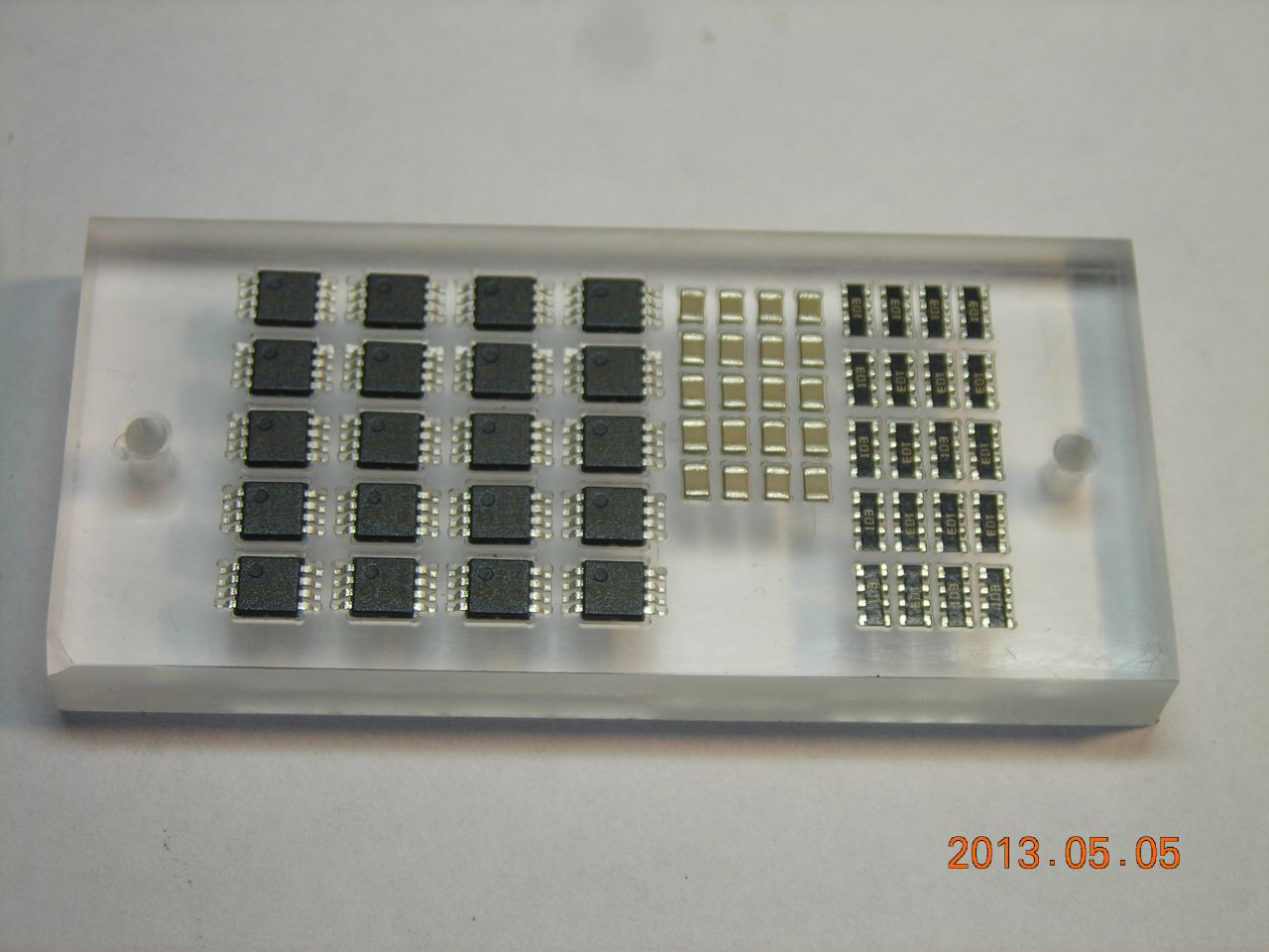 Instead of trying to pick the parts from their original carrier tapes, I chose to load them into a small jig instead. The hole positions in the jig are accurately known, so it's easier to pick the part up.
