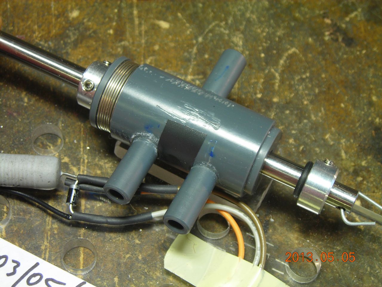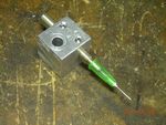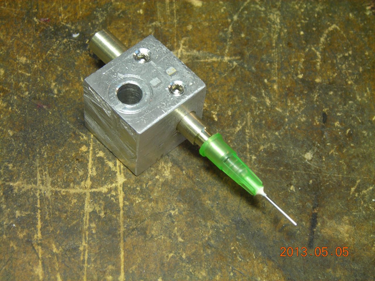 I made a simple 3-way solenoid valve to connect a nozzle to either vacuum or to the open air. The solenoid is controlled by the spindle relay output on the CNC router's controller. The nozzle itself is a small hypodermic needle with the end sanded square.