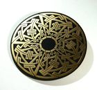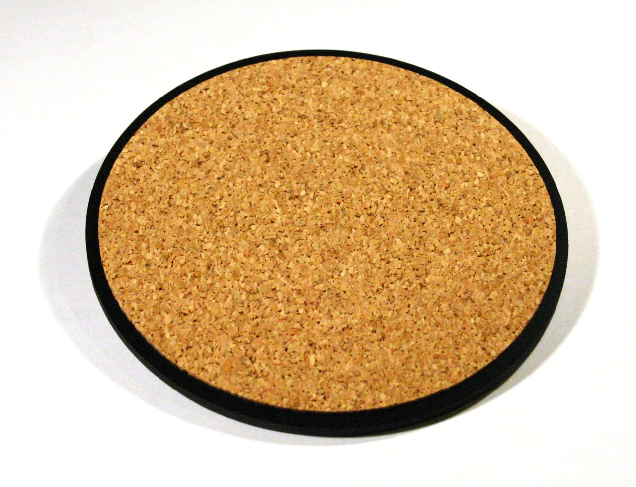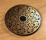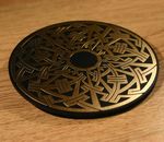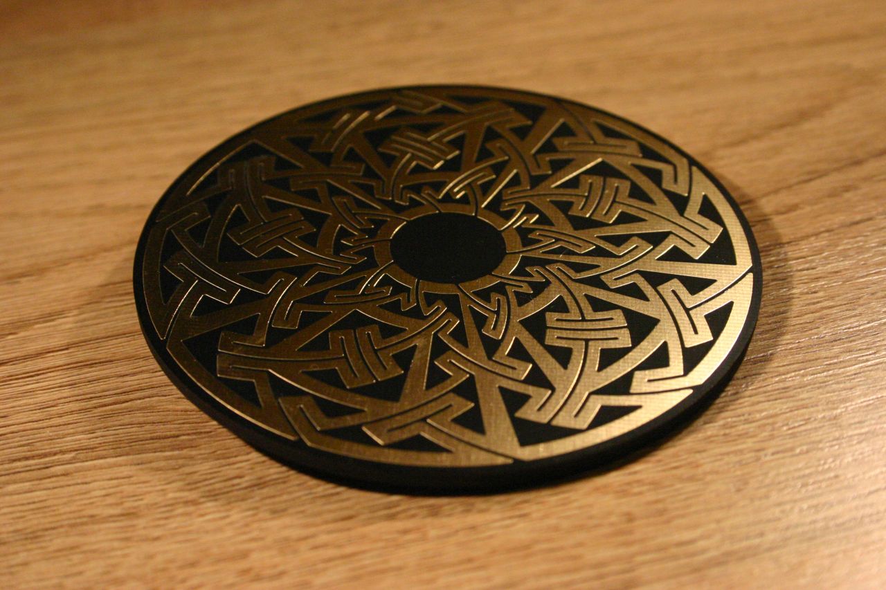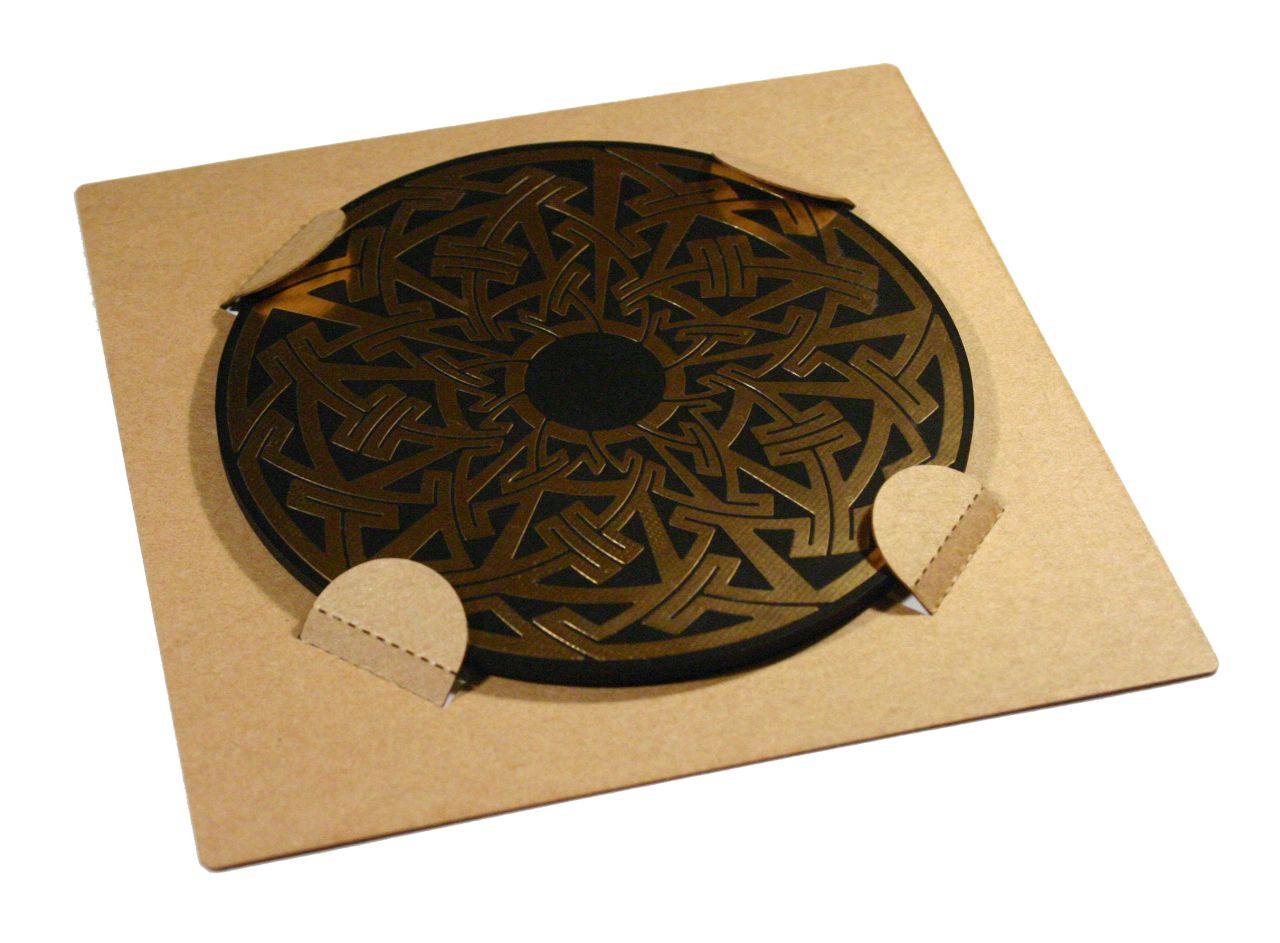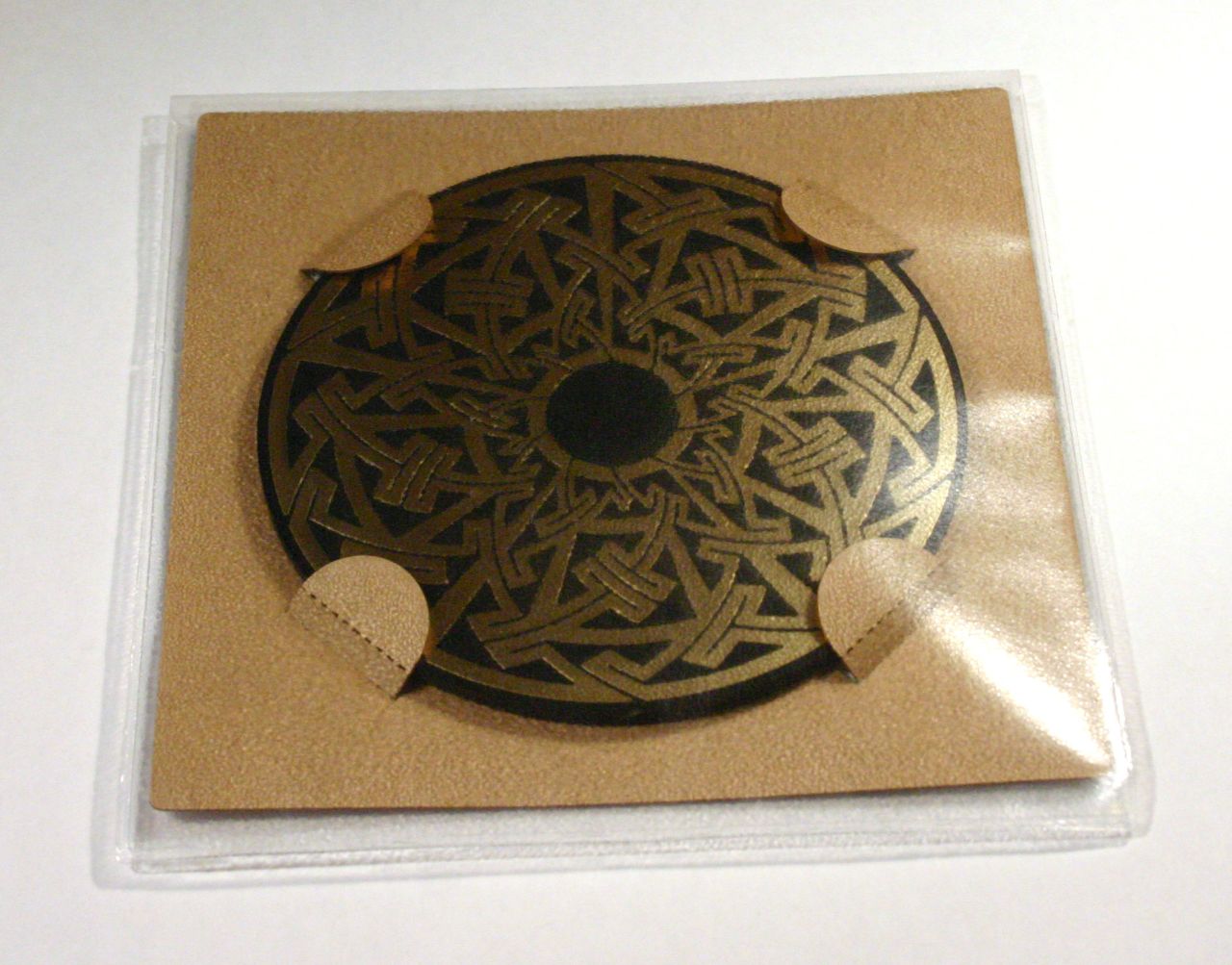 Here they are. The design itself uses electrolytic gold plating over the copper, and a black soldermask on both sides. The board material is 2.4mm, which is thicker than the normal 1.6mm and makes it feel much more rigid. There's a non-slip cork backing, and I've made up a little card holder + plastic sleeve to present them in. They're 9cm diameter.