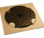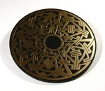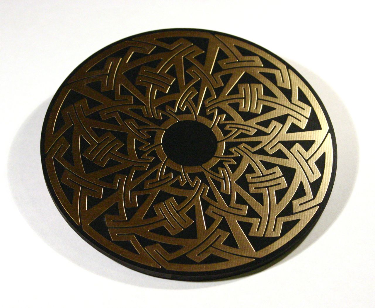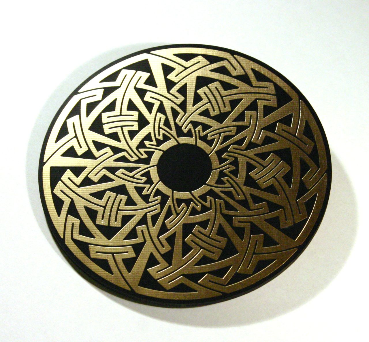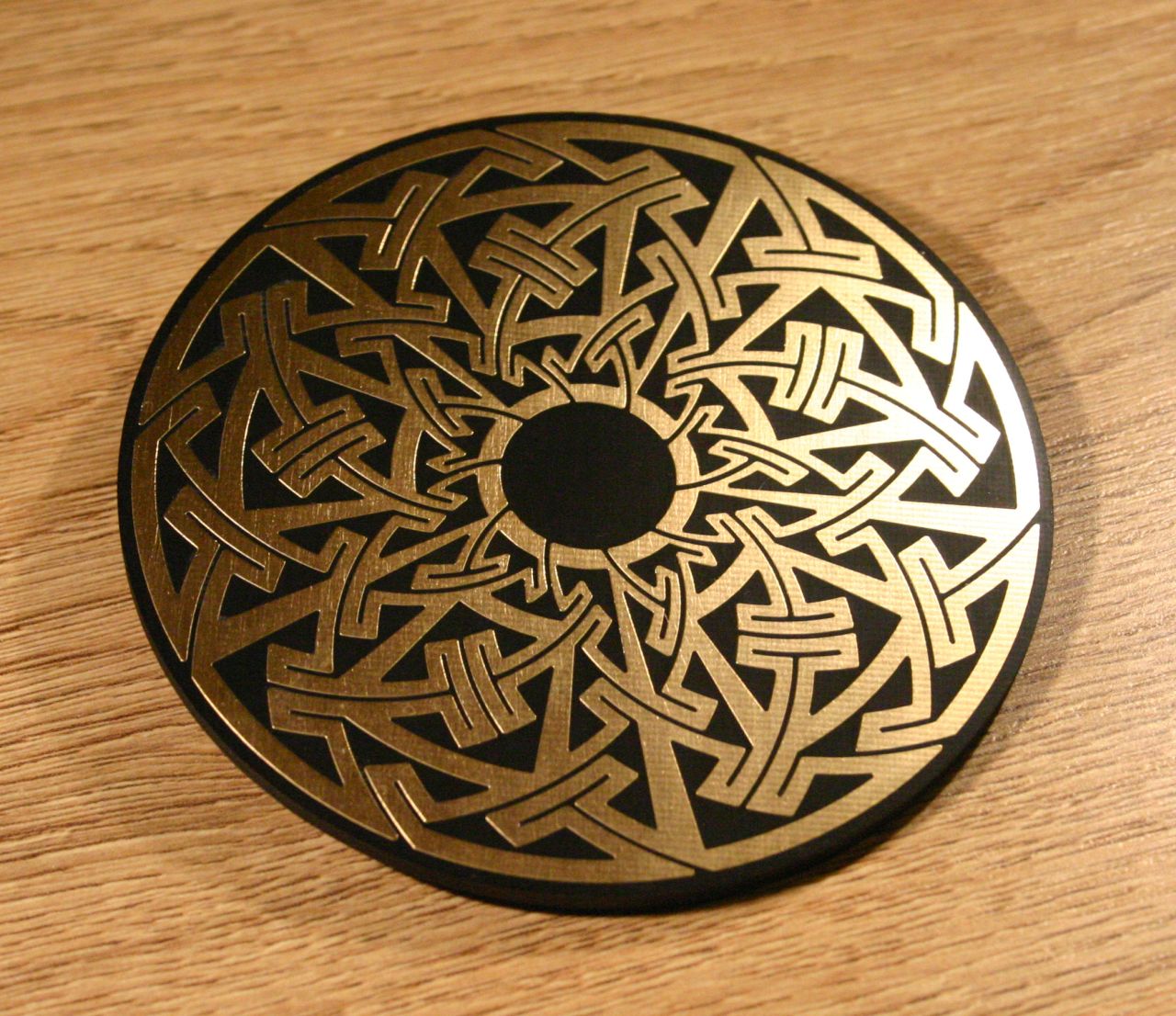 I like designing circuit boards. Over the winter, we (as in Skye Silver) were playing around with Celtic/Pictish key pattern designs and getting thoroughly fascinated with them. These are NOT your usual knotwork/interlace things, although they're vaugely similar. Anyway, having seen the sort of techniques available in PCB production (gold plating, solder mask, silk screen, routing etc.), I thought it would be really neat to make some drinks coasters featuring a key pattern design, made entirely with standard PCB processes.