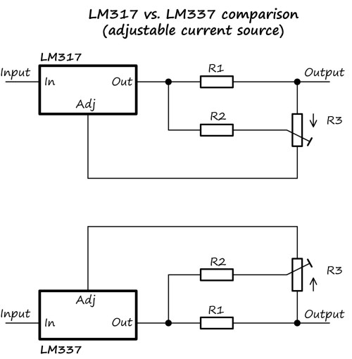 A reader asked how the circuit would look if used with an LM337 negative adjustable regulator. Basically, exactly the same! I've shown both circuits below - you can see how the LM337 circuit has the same connections; I've just flipped it upside-down for ease of viewing, since that's usually now negative regulators are depicted.