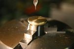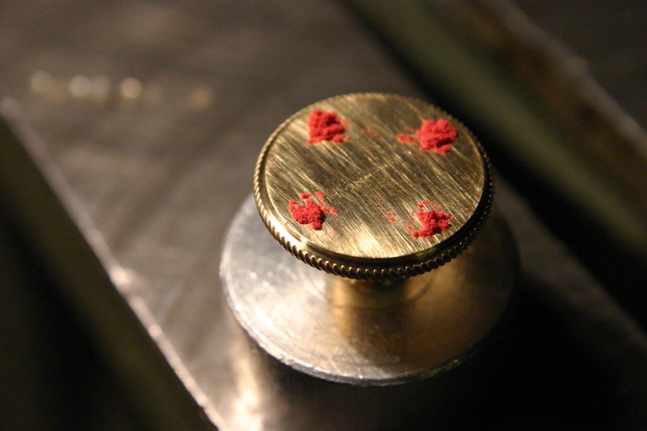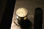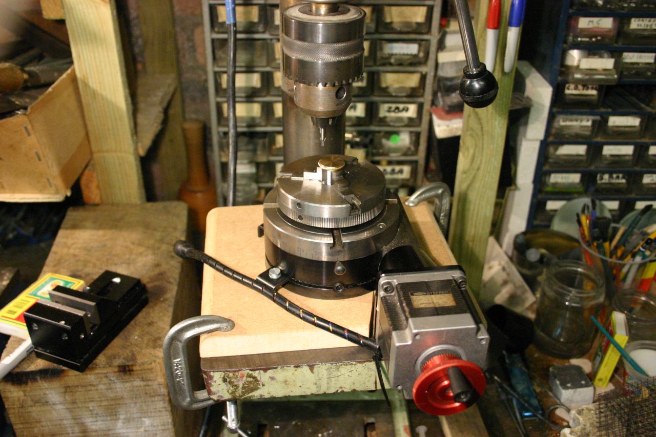 |  Rotary table set up on drill press |  |  Holes drilled |  Transparent red powder coat |