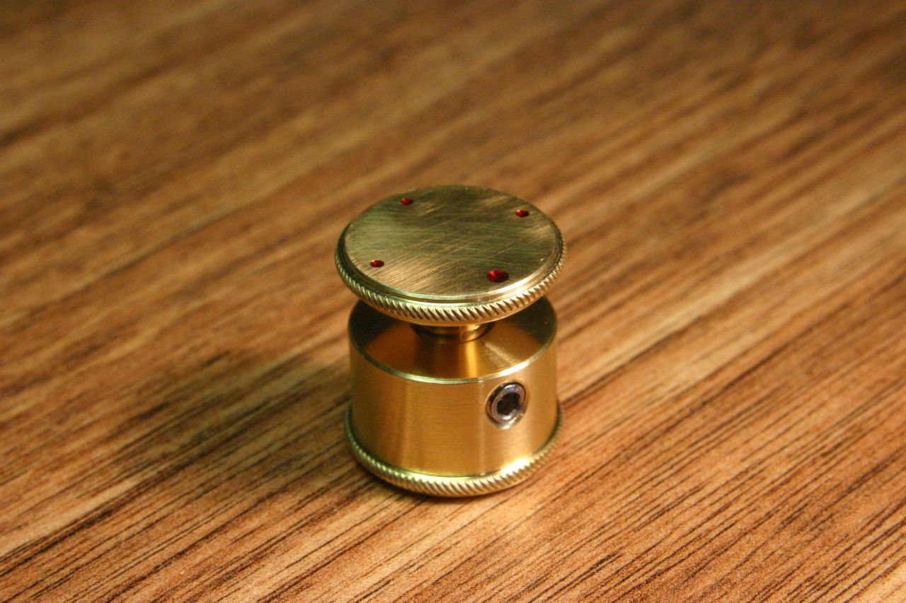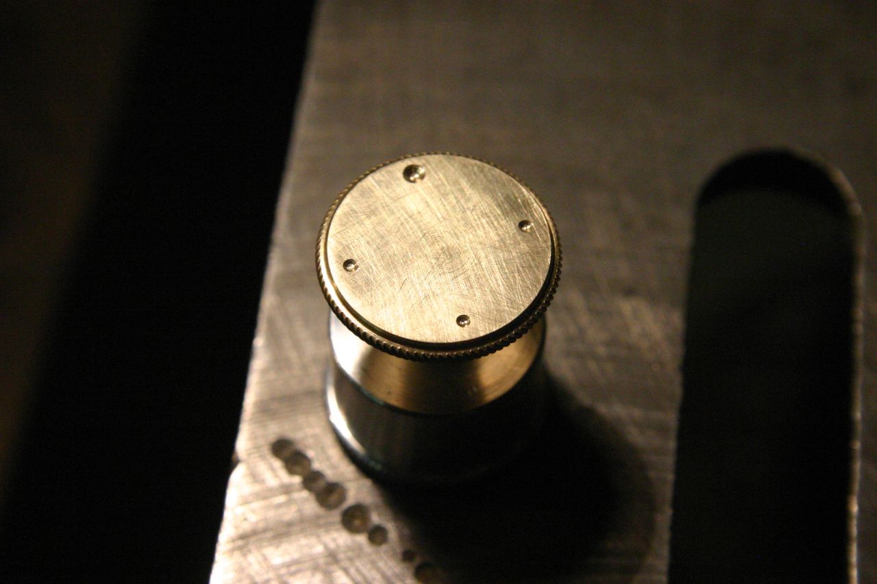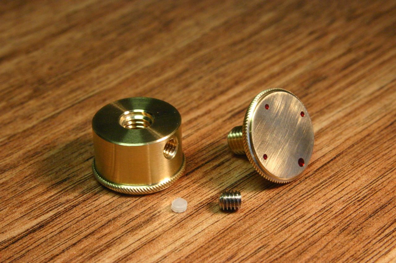 This is a rather over-engineered tool to aid in setting the correct height of the lens on the laser cutter. It consists of a theraded "platform" which screws into a base. Platform and base are both rope knurled for grip and appearance. A grubscrew with a small piece of nylon underneath is used to lock the platform in position, or to provide a "stiff" feel (some heavy damping grease is used on the thread as well). The top of the platform has three small holes drilled in it which are filled with transparent red powder coat. These dots help in setting the height - fully closed, the height is 15mm, and the thread is 1mm pitch, making it easy to adjust without the need for calipers.