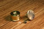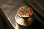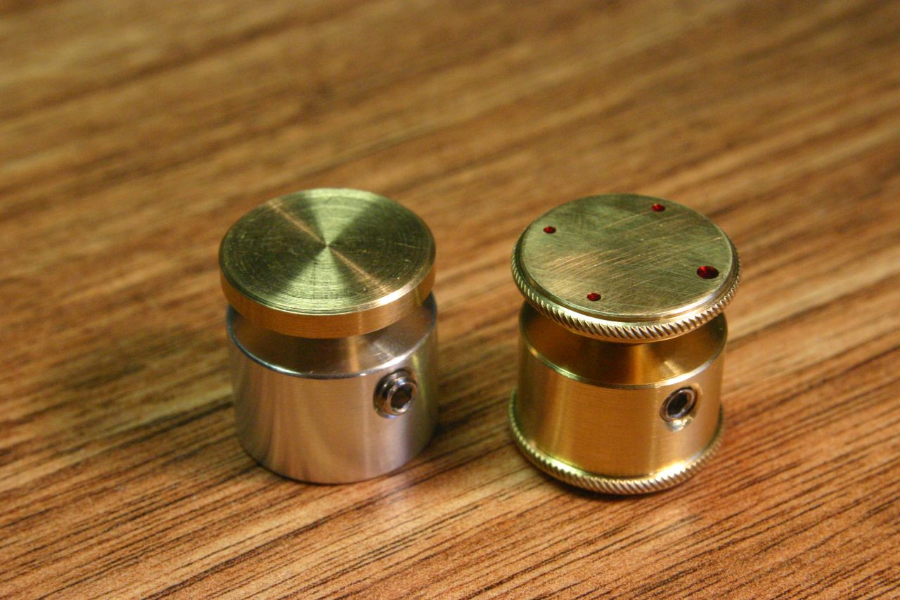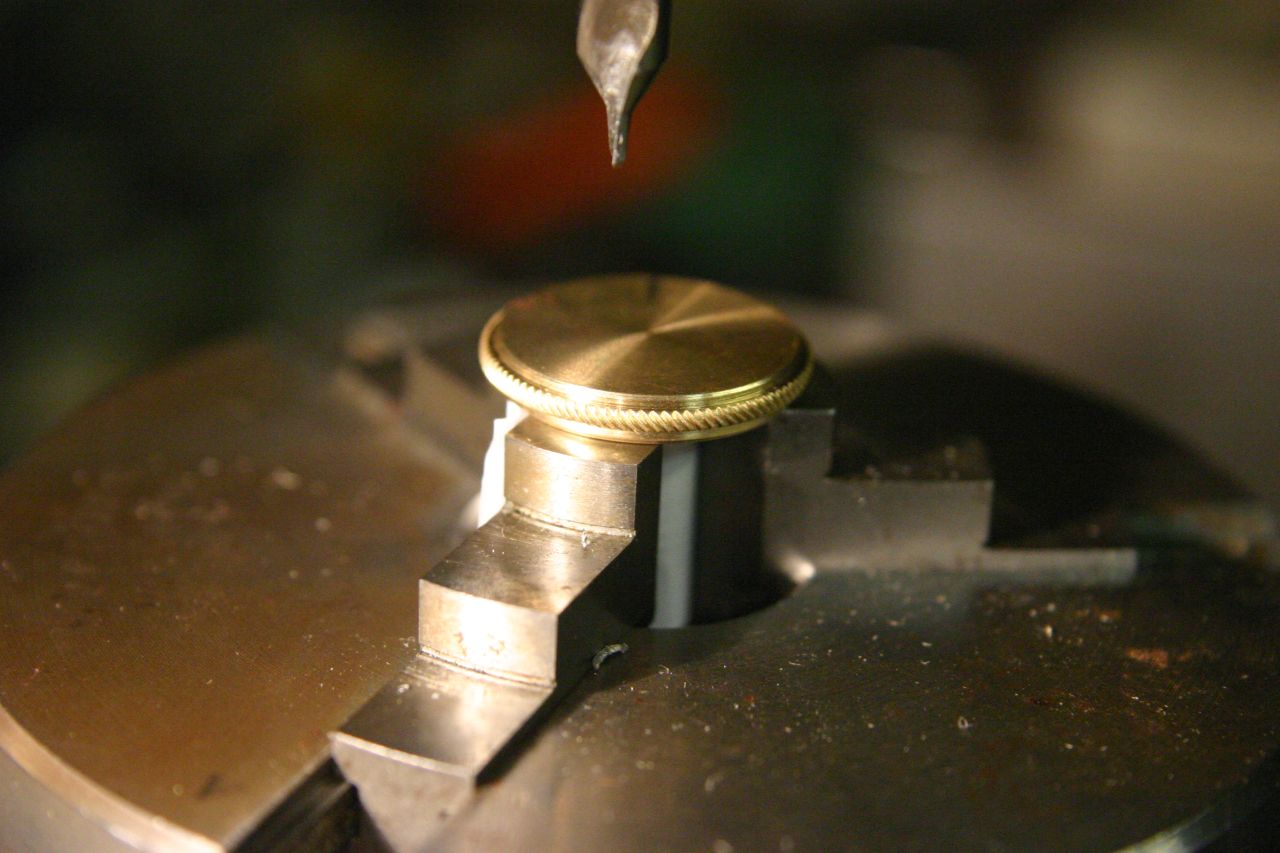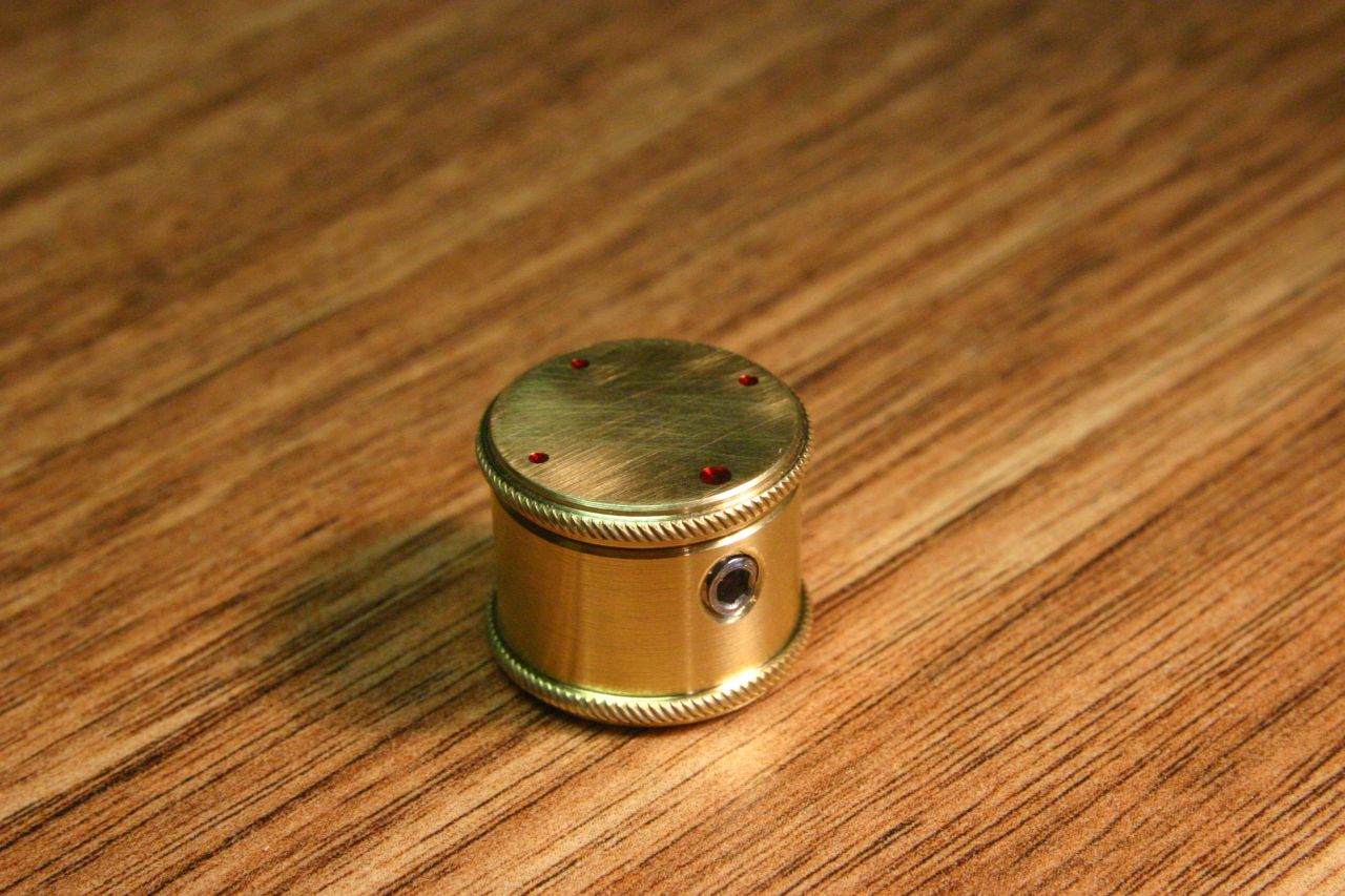 This is a rather over-engineered tool to aid in setting the correct height of the lens on the laser cutter. It consists of a theraded "platform" which screws into a base. Platform and base are both rope knurled for grip and appearance. A grubscrew with a small piece of nylon underneath is used to lock the platform in position, or to provide a "stiff" feel (some heavy damping grease is used on the thread as well). The top of the platform has three small holes drilled in it which are filled with transparent red powder coat. These dots help in setting the height - fully closed, the height is 15mm, and the thread is 1mm pitch, making it easy to adjust without the need for calipers.