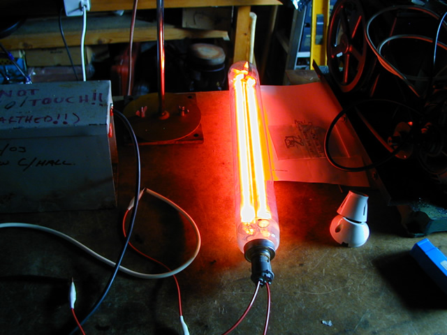 Discovered that it will run off an electronic ballast (from uni skip!) meant for a fluorescent light. Much brighter than the NST. One note with the electronic ballasts: you have to make them "see" a "proper" fluorescent tube. What I did was use two 100W 20Ω resistors to mimic the filaments in the tubes and then connect the street light across the two "filaments". It ran quite happily.