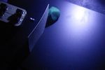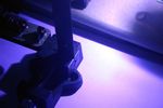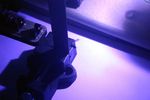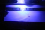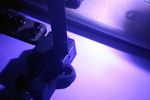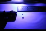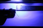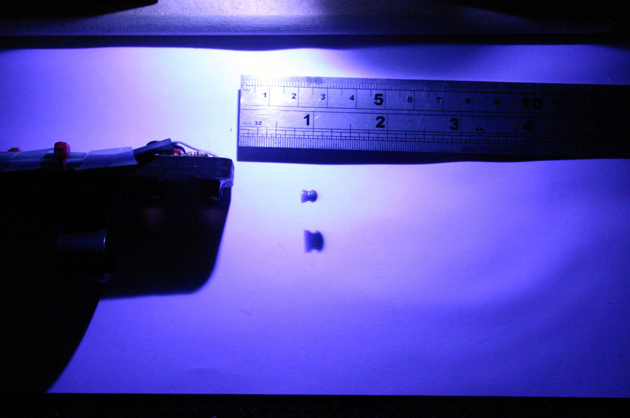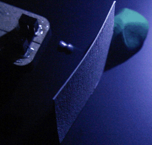 Here's a collection of all the shots I managed to take. The light isn't actually very bright, but it clearly froze the pellet nicely. The first three show the pellet in free flight, as I was adjusting the delay time from minimum to maximum. Next, the pellet passes through a piece of card (luckily I managed to get before and after shots). Finally, I fired the pellet at a craft knife blade to split it, and managed to get four progressive shots. The knife splits the pellet beautifully!