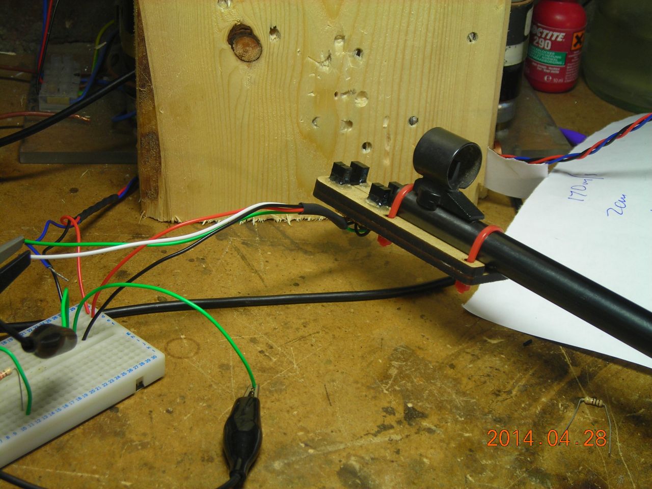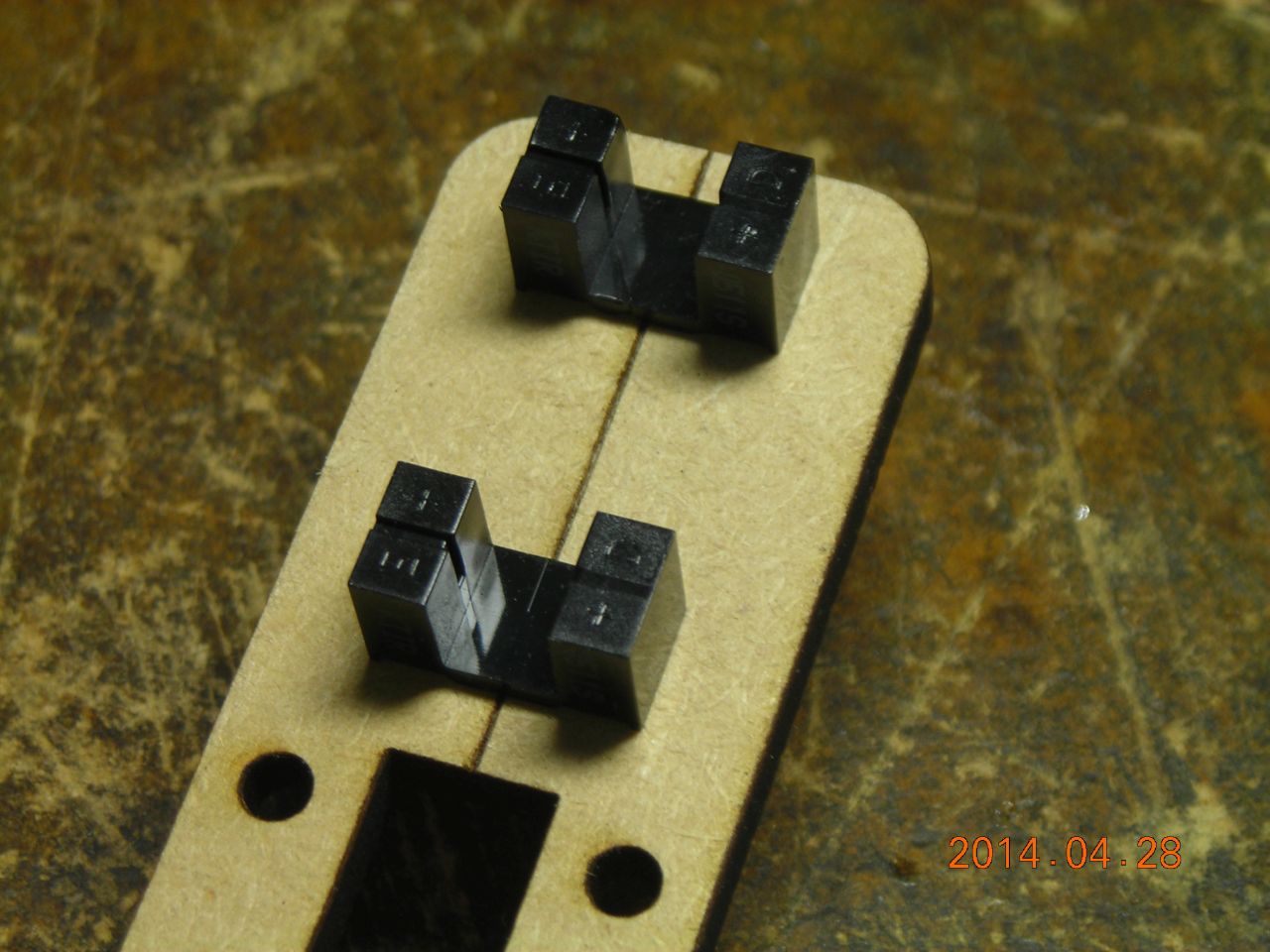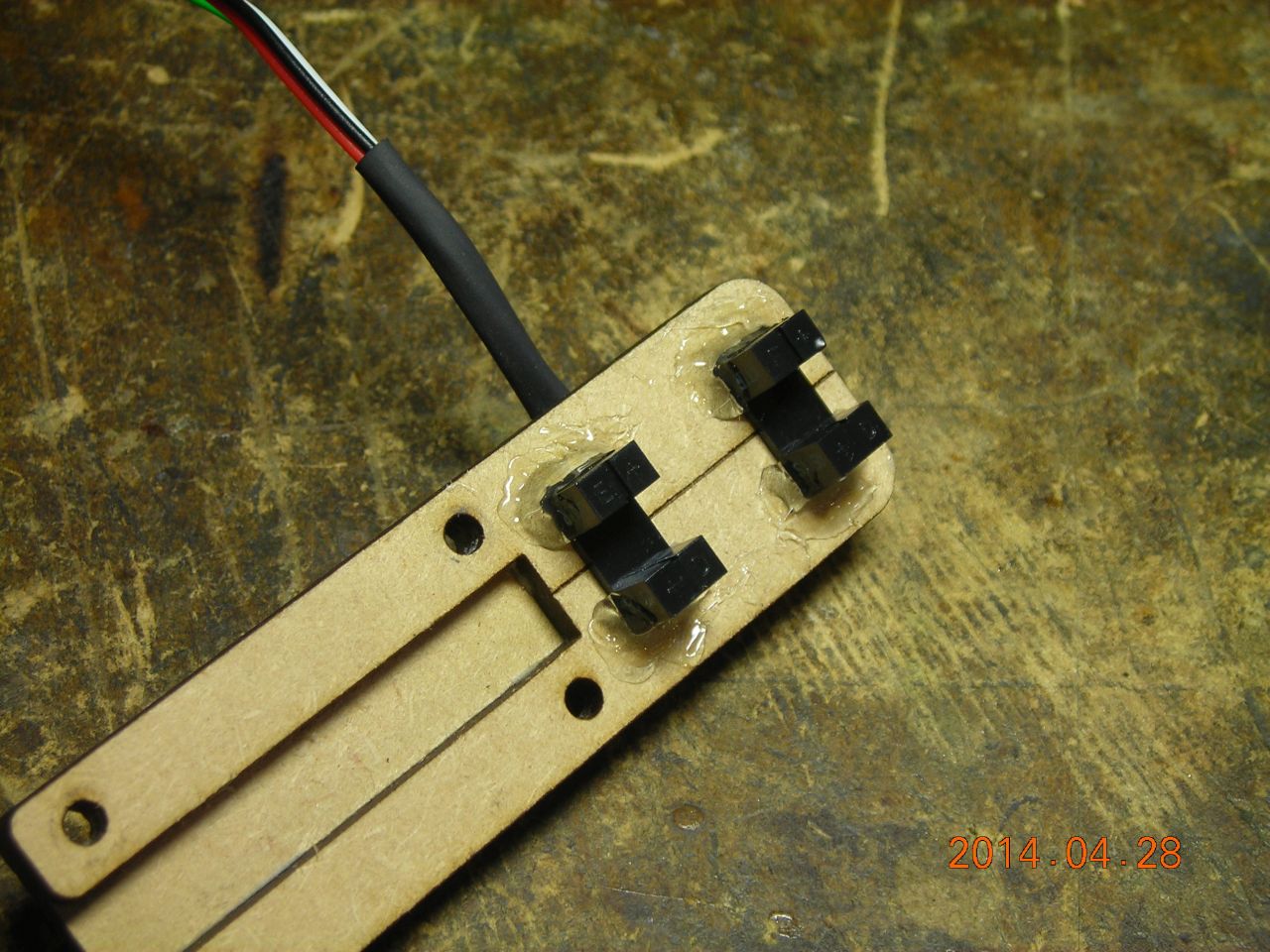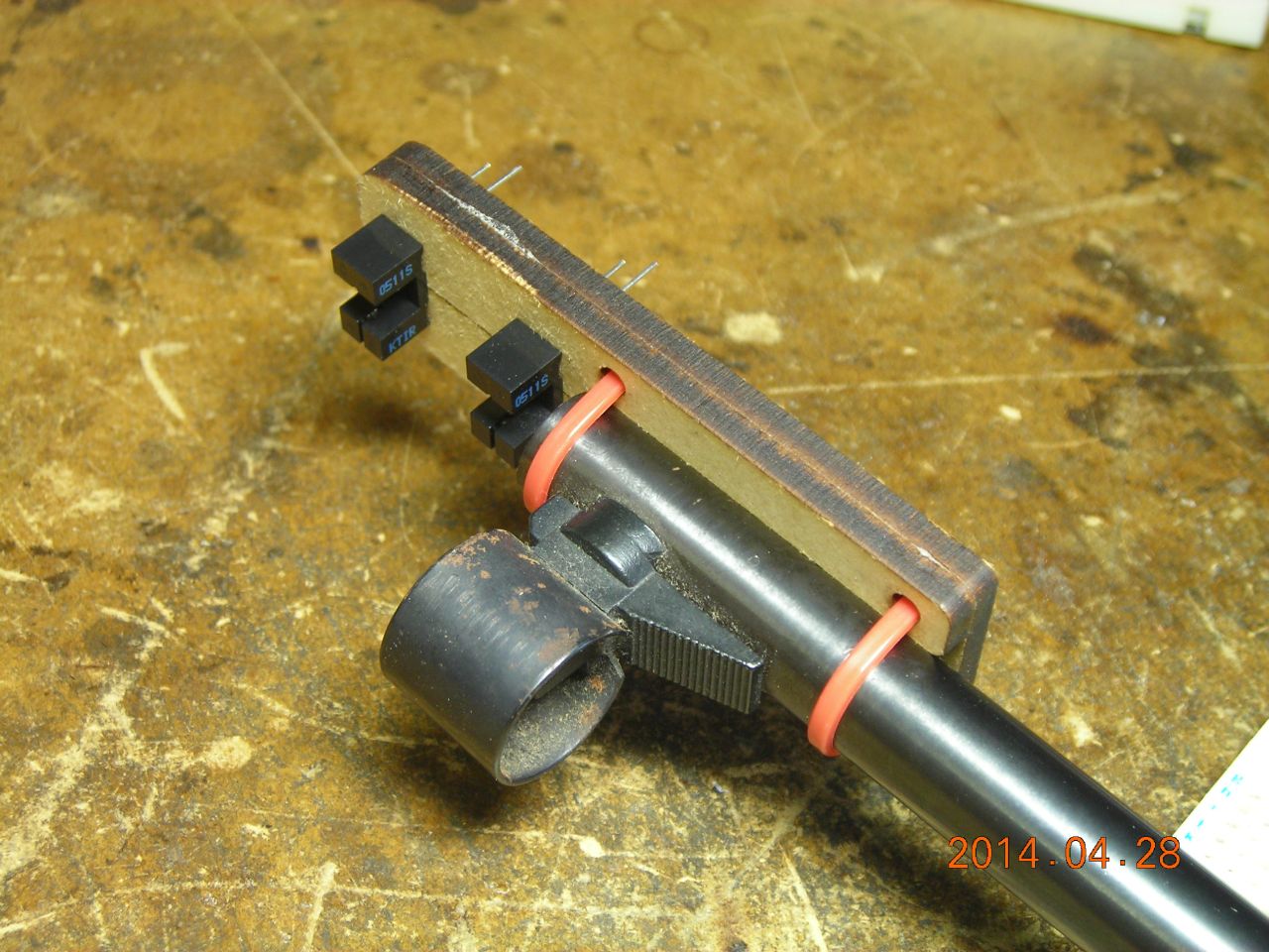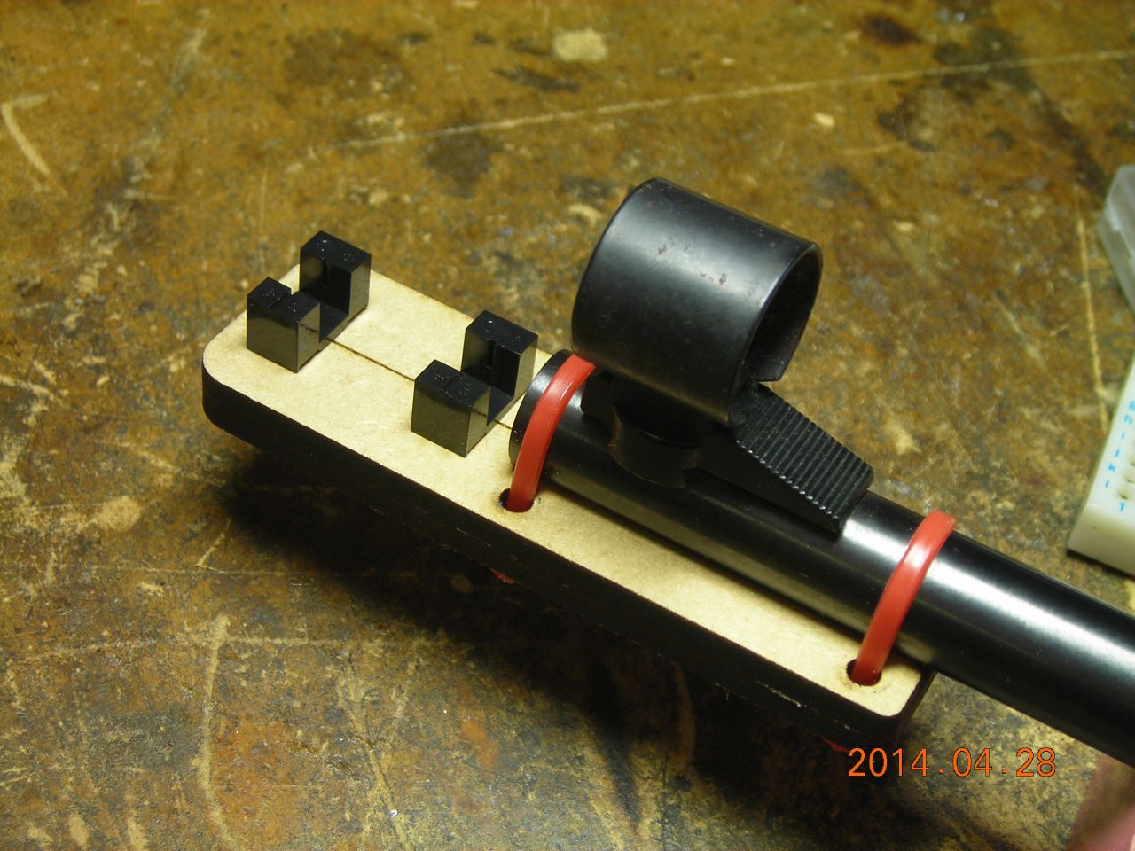 This little fitting was laser-cut from 3mm MDF and is attached to the end of the barrel with cable ties. The legs of the two slotted optical sensors (Kingbright KTIR0511S) are located in small holes in the wood, ensuring that they are aligned with the path of the pellet. The sensors are exactly 2cm apart.