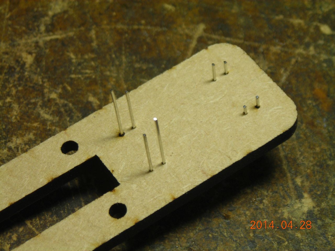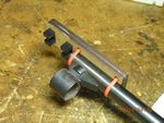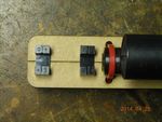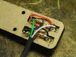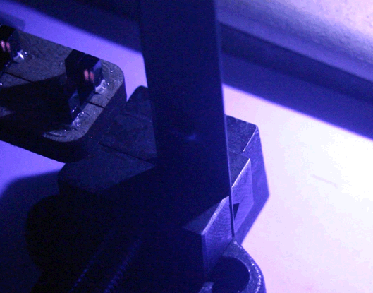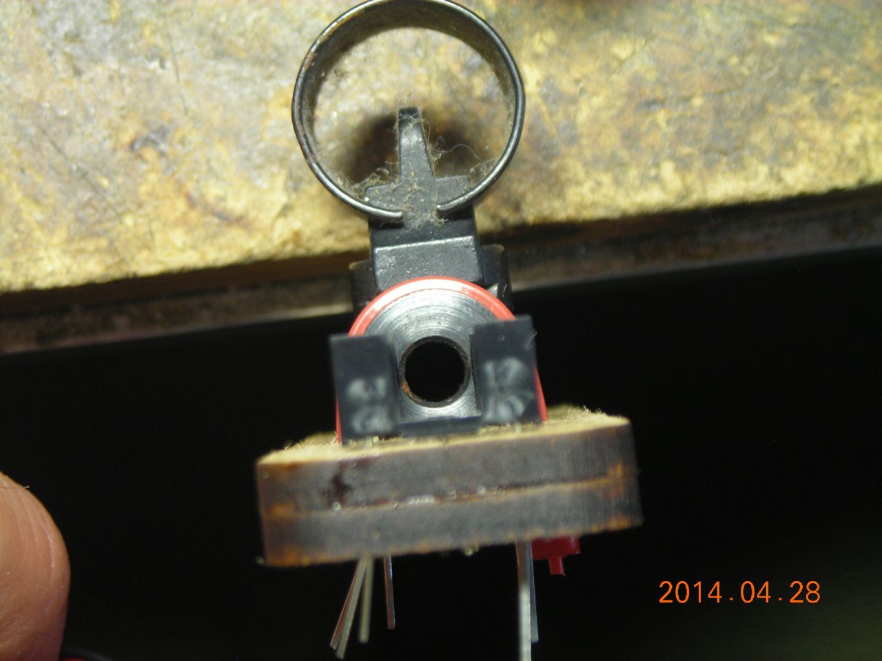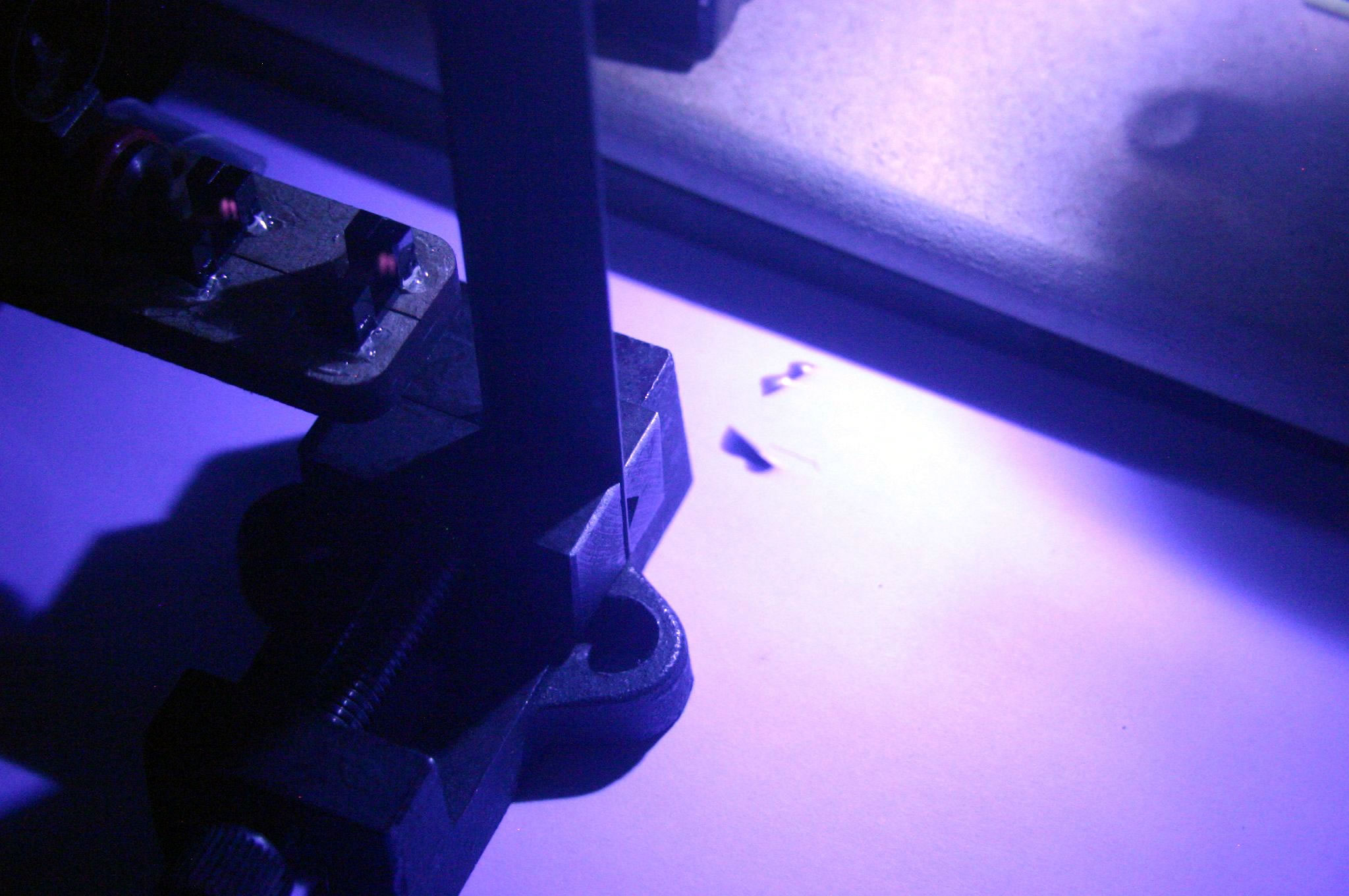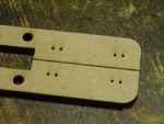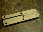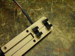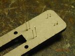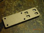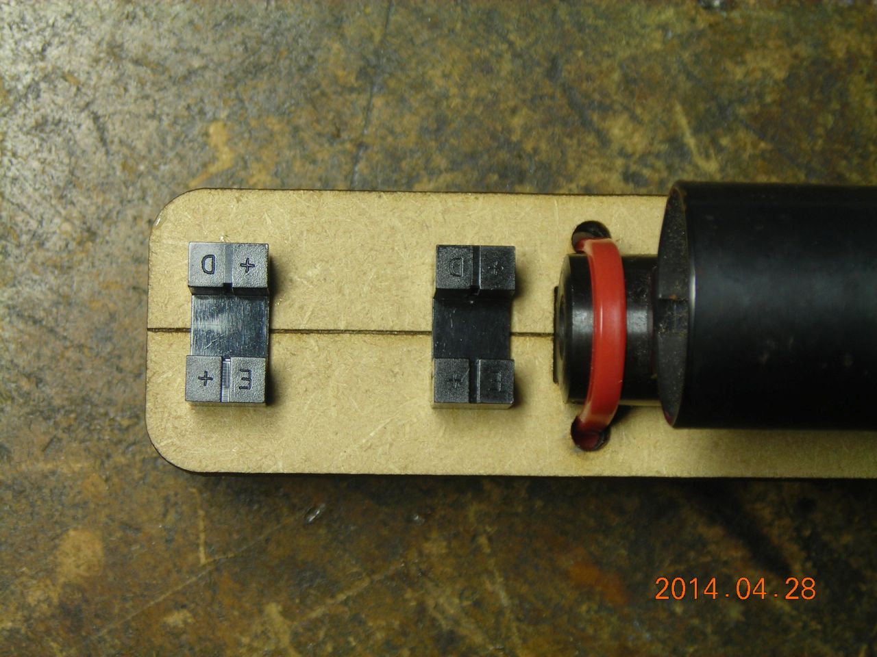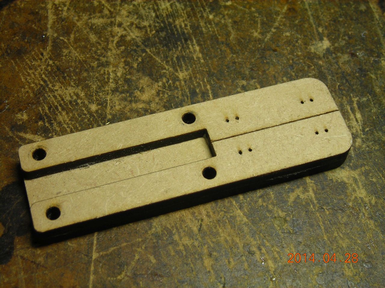 This little fitting was laser-cut from 3mm MDF and is attached to the end of the barrel with cable ties. The legs of the two slotted optical sensors (Kingbright KTIR0511S) are located in small holes in the wood, ensuring that they are aligned with the path of the pellet. The sensors are exactly 2cm apart.