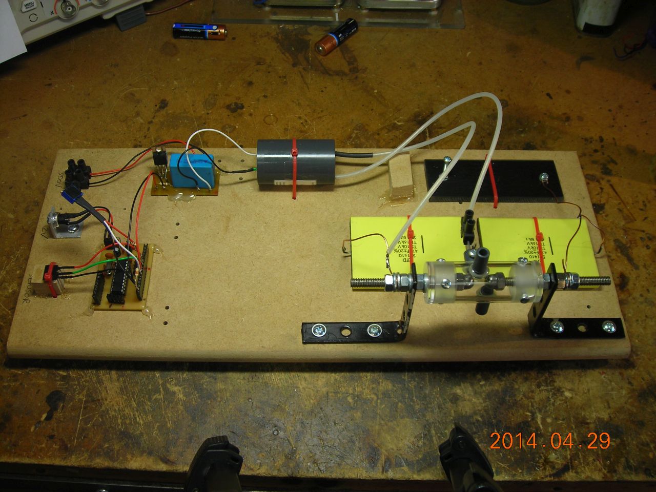 I used the pulse from the first sensor to trigger a PIC micro which delays a fixed amount of time, then produces a 50µs-long trigger pulse to a thyristor+trigger transformer assembly, which in turn fires a spark gap, producing illumination.