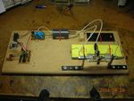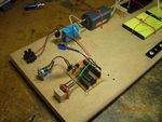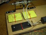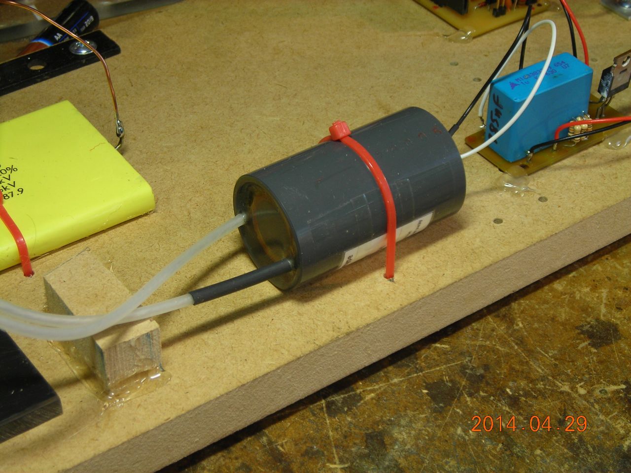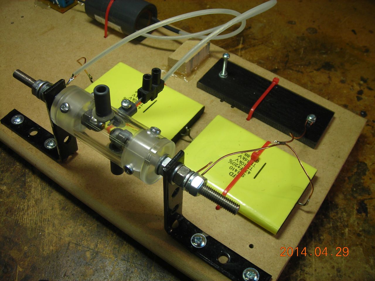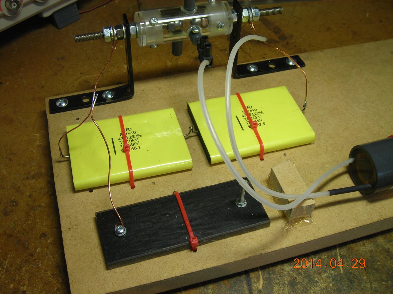 High-voltage stuff. A 15kV supply charges up two capacitors (connected in series to get suitable voltage rating) via a 20MΩ resistor. This is actually some diluted graphite coating painted on to a piece of acrylic - see here for details. The spark gap is two M6 stainless dome nuts inside an acrylic housing, with a sharp trigger electrode placed near one of them. An airflow is provided to keep the gas clean.