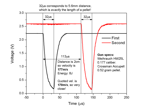 Here's a graph showing the outputs of both sensors as the pellet passes. The output is normally high, at around 2.5V, and goes low when the beam is blocked by the pellet. The time to travel between the two sensors is 113µs, corresponding to a velocity of 177m/s (the sensors are 2cm apart). This is very close to the manufacturer's quoted velocity of 170m/s. Additionally, the time for which the pellet blocks the sensor is 32µs, corresponding to 5.6mm, which is exactly the length of a pellet. Rather nice to see it all checks out.