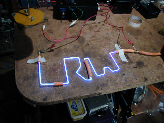 It's running off a 30kV flyback power supply. Incidentally, I stuck a meter in the circuit and found that around 3mA of current was flowing. 3mA @ 30kV = 90W; not bad for a flyback.