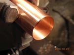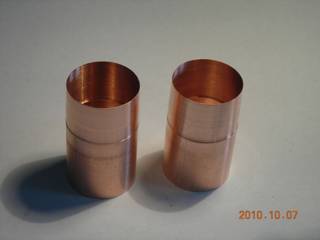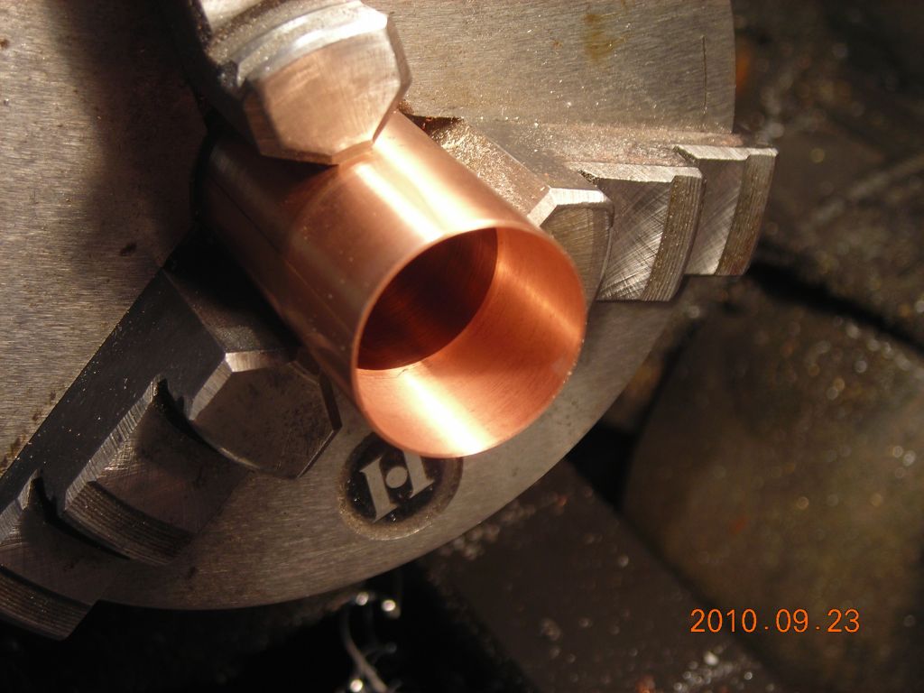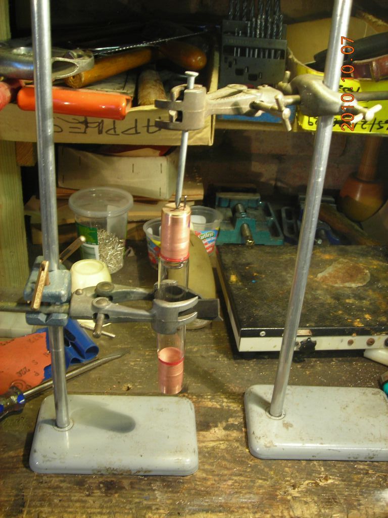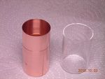 As luck would have it, 22mm diameter copper tube (a standard plumbing size) combines nicely with 24mm diameter test tubes. The tube is first bored out to get a smooth internal diameter and an expanding plug inserted & tightened to allow the outside to be turned without the wall collapsing. The outside is polished with fine sandpaper to get a smooth finish.