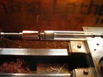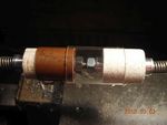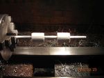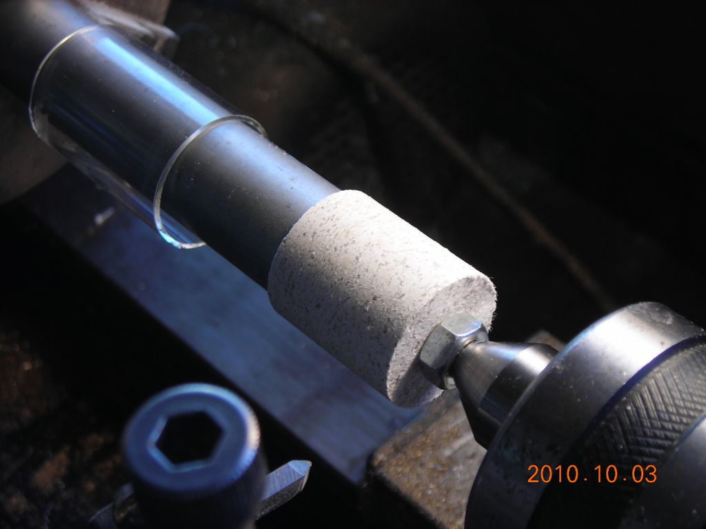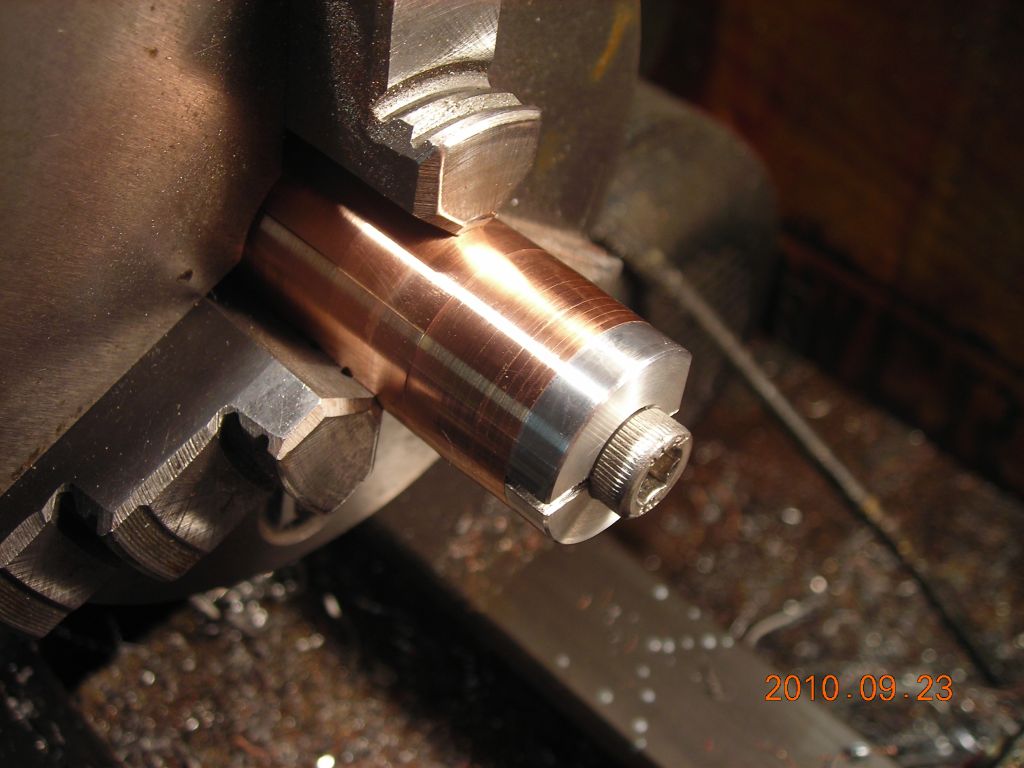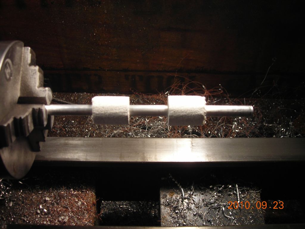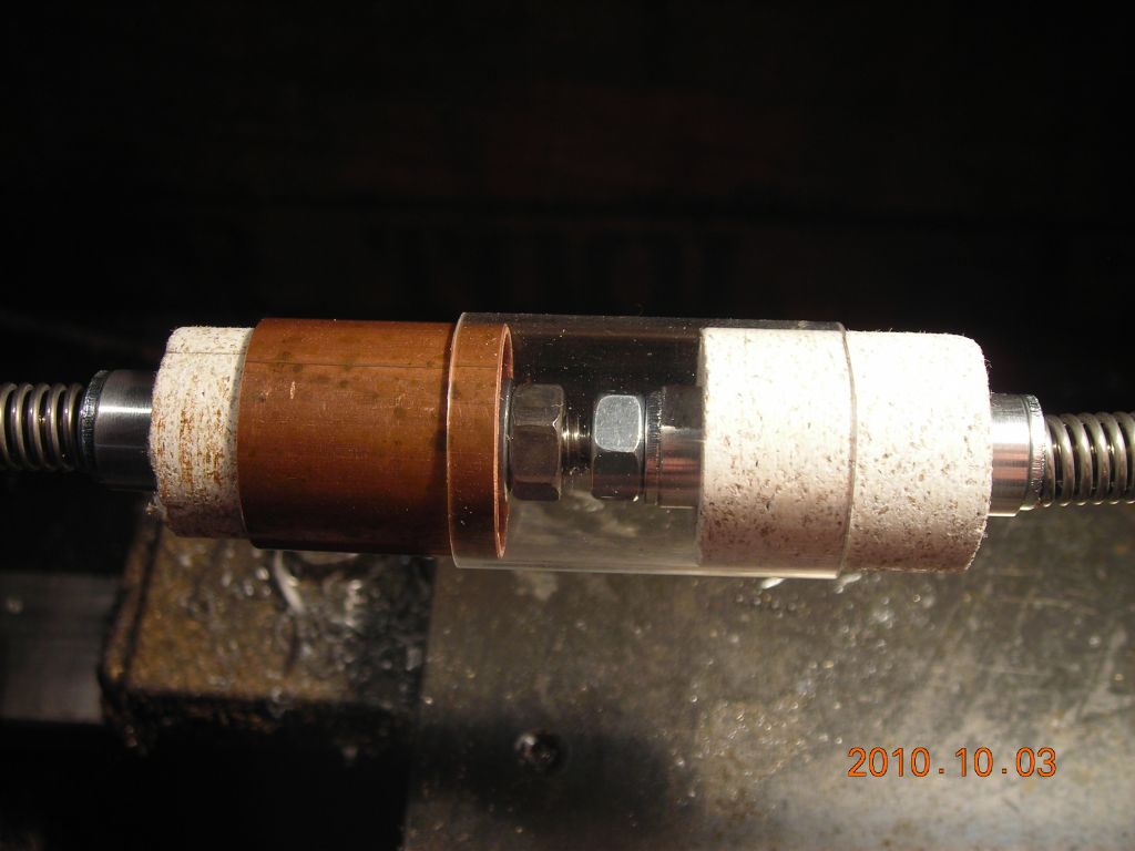 The copper tube and glass tube are held on cylindrical insulating spacers on a metal rod held in the lathe chuck. The insulating spacers were turned from chunks of a firebrick-like material which is used for soldering bits of jewellery on (available from HS Walsh among others). It's a very soft, fibrous board which can easily be machined to shape (but is asbestos-free).