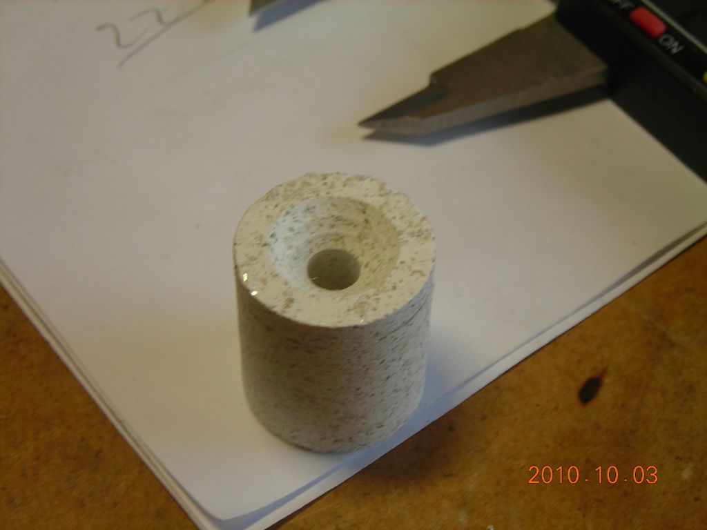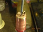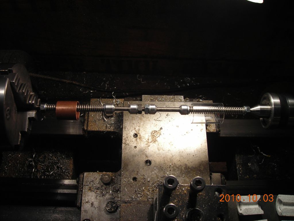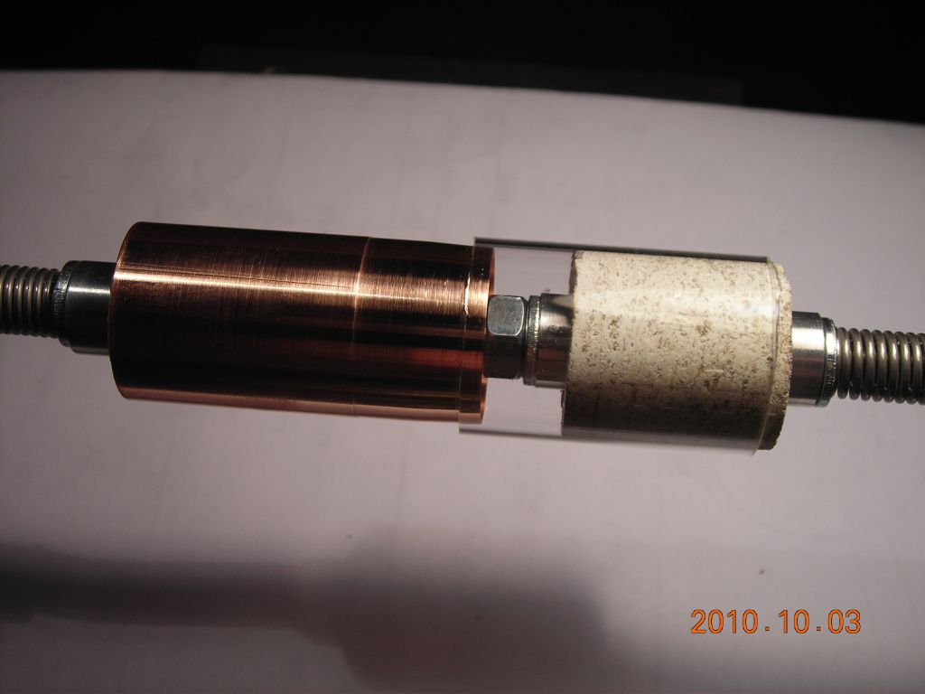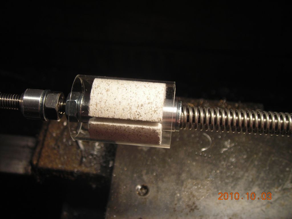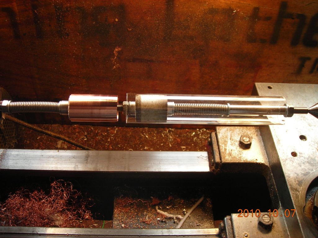The copper tube and glass tube are held on cylindrical insulating spacers on a metal rod held in the lathe chuck. The insulating spacers were turned from chunks of a firebrick-like material which is used for soldering bits of jewellery on (available from HS Walsh among others). It's a very soft, fibrous board which can easily be machined to shape (but is asbestos-free).