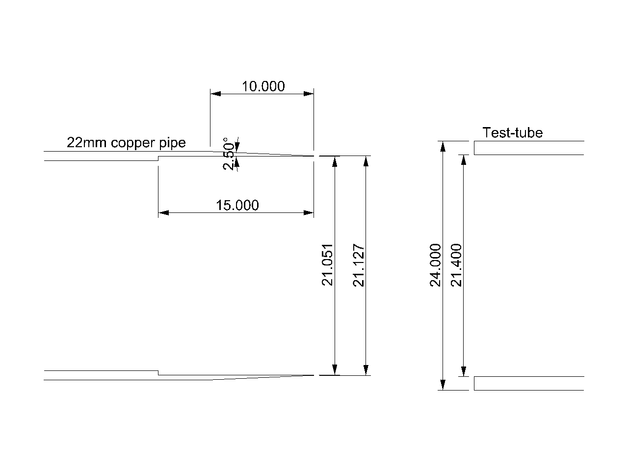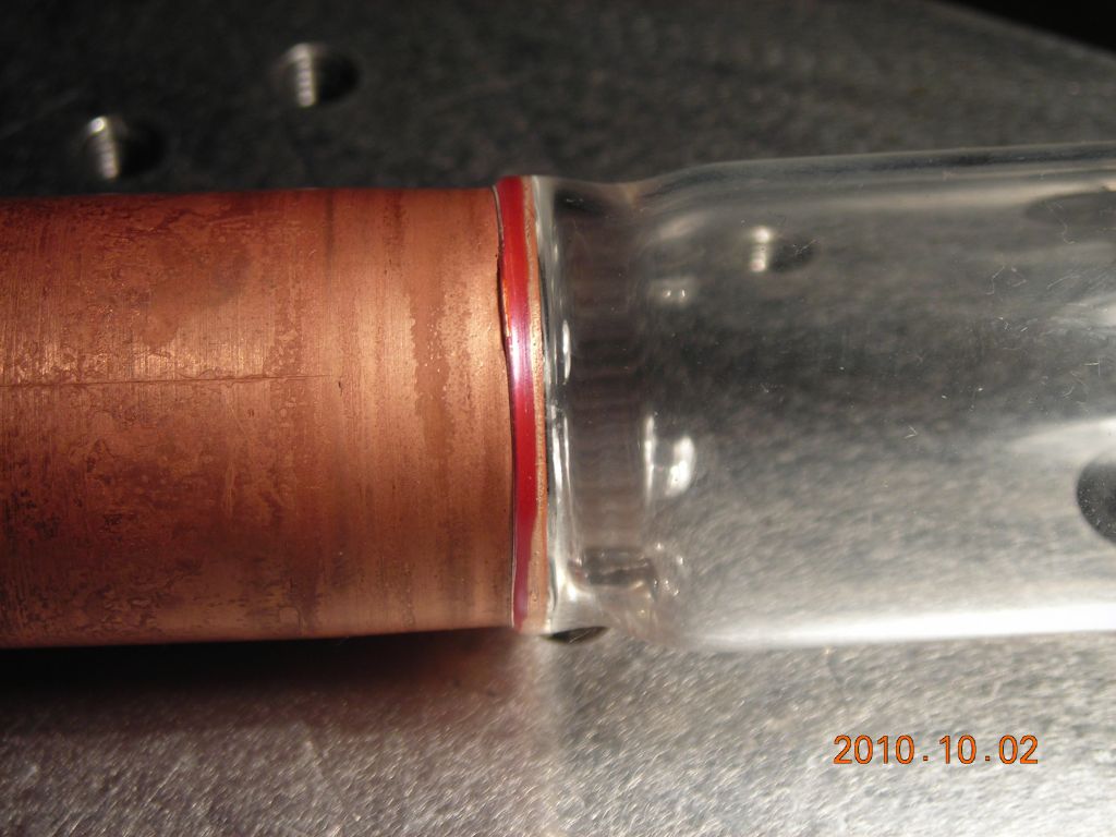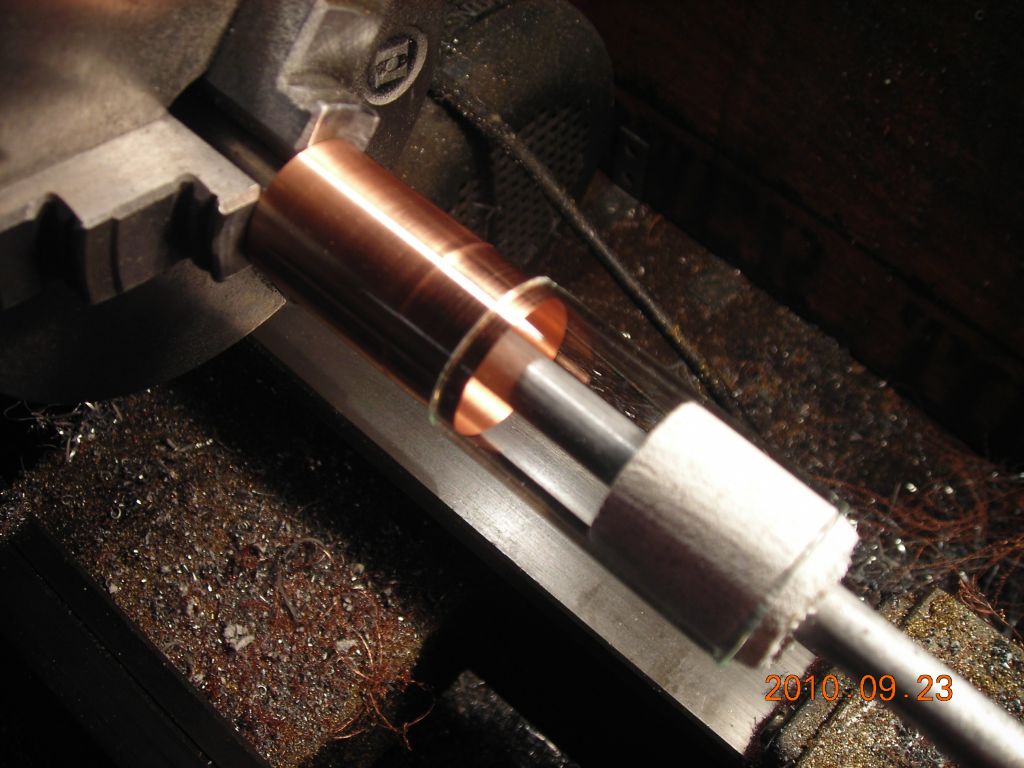 The edge of the copper tube to which the glass is sealed must be machined to an extremely thin feather edge. This ensures the copper can be stretched by the glass upon cooling. The edge should be around 40μm thick, tapering back at a 2.5° angle to a maximum of about 1mm thickness.