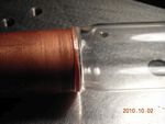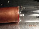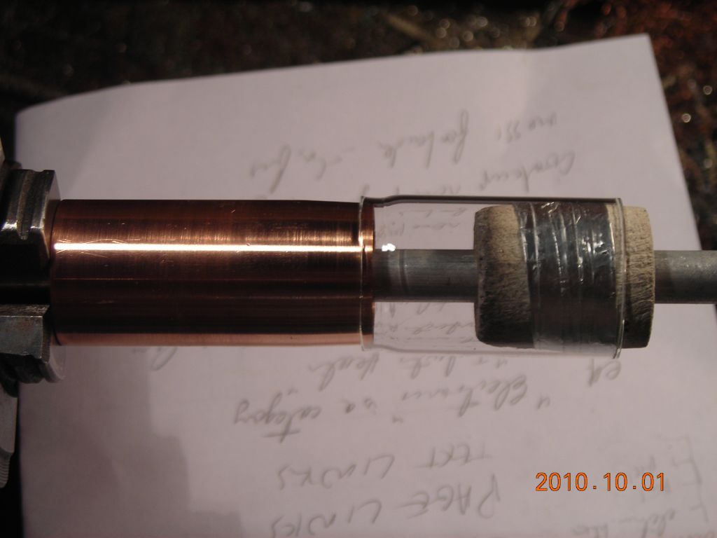 Note how the glass tube has buckled near the join - this was a result of the poor holding arrangement. The glass and copper tubes are relatively loose on the insulating spacers, so when I tried to push the glass tube towards the copper I managed to deform the edge. Clearly, a better way of holding the tubing is needed.