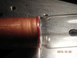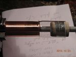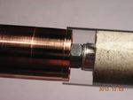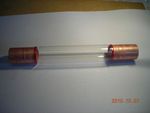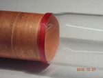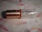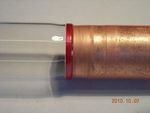 This time, I pre-oxidised the seal to the colour shown in the picture below. I simply heated the copper tube with the torch until the feather edge gradually turned that colour. Notice that it appears to be flaky - this didn't seem to be a problem, fortunately. The smoother the surface is, the less flaking occurs, so try and get a mirror finish on the copper beforehand. Also, when I was heating the copper tube to oxidise it, I slid the glass tube out of the way, both to protect it from the heat, and also to allow air to reach all parts of the feather edge of the copper tube. Once it was oxidised, the glass was slid back into place and the seal made.
