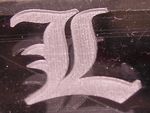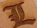 First wood raster engrave (29/05/09). This was raster engraved on a piece of MDF, about 50% power. It's really deep (almost 1mm!) and is very sharp - the photo doesn't do it justice. Note the streaking from the fumes produced - the extraction was pulling fumes to the top of the L, hence the streaks.