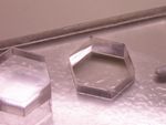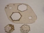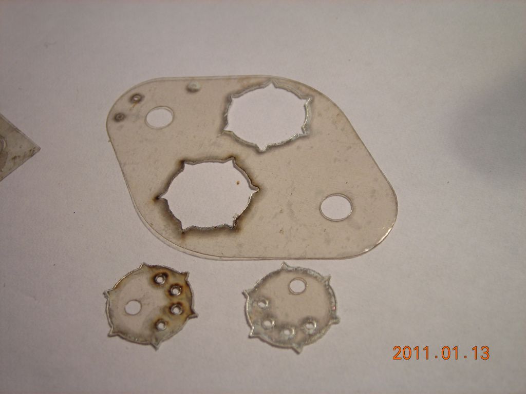 While making the text discharge tube, I needed a means of making nice mica spacers to hold the cathode inside the tube. It turned out that it's possible to cut mica with the laser reasonably well. The photos below show some trial cuts from a TO-3 mica insulator, but check out the text discharge tube page for more examples. There is slight delamination up to about 2mm from the edge, but the very edge seems fused together so they don't separate.