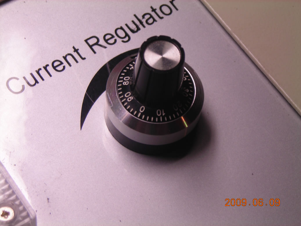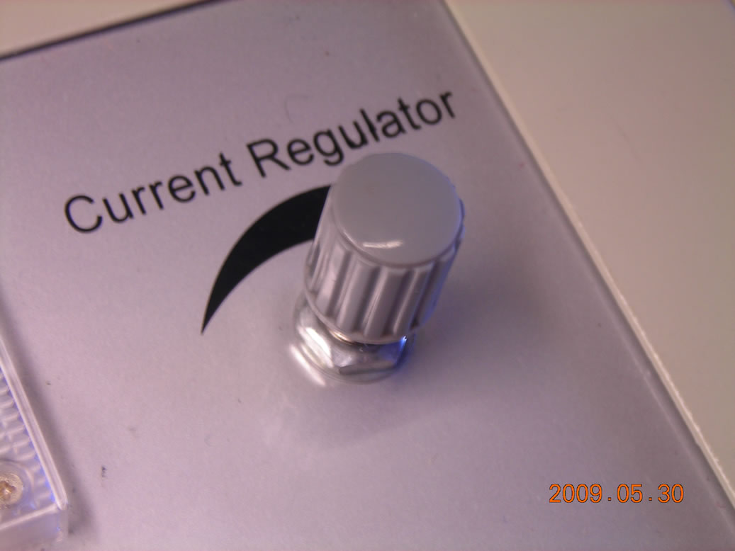 Multiturn knob (09/06/09). The knob used to adjust the laser current is multiturn, and there is normally no way of knowing which turn it's on, without actually firing the laser and measuring the current. It's easy to fix this - I put on a 10-turn counting knob instead. The pot shaft is 4mm diameter, so I made a little 4mm to 1/4" bush to fit the knob. Original knob. Knob removed. New knob.